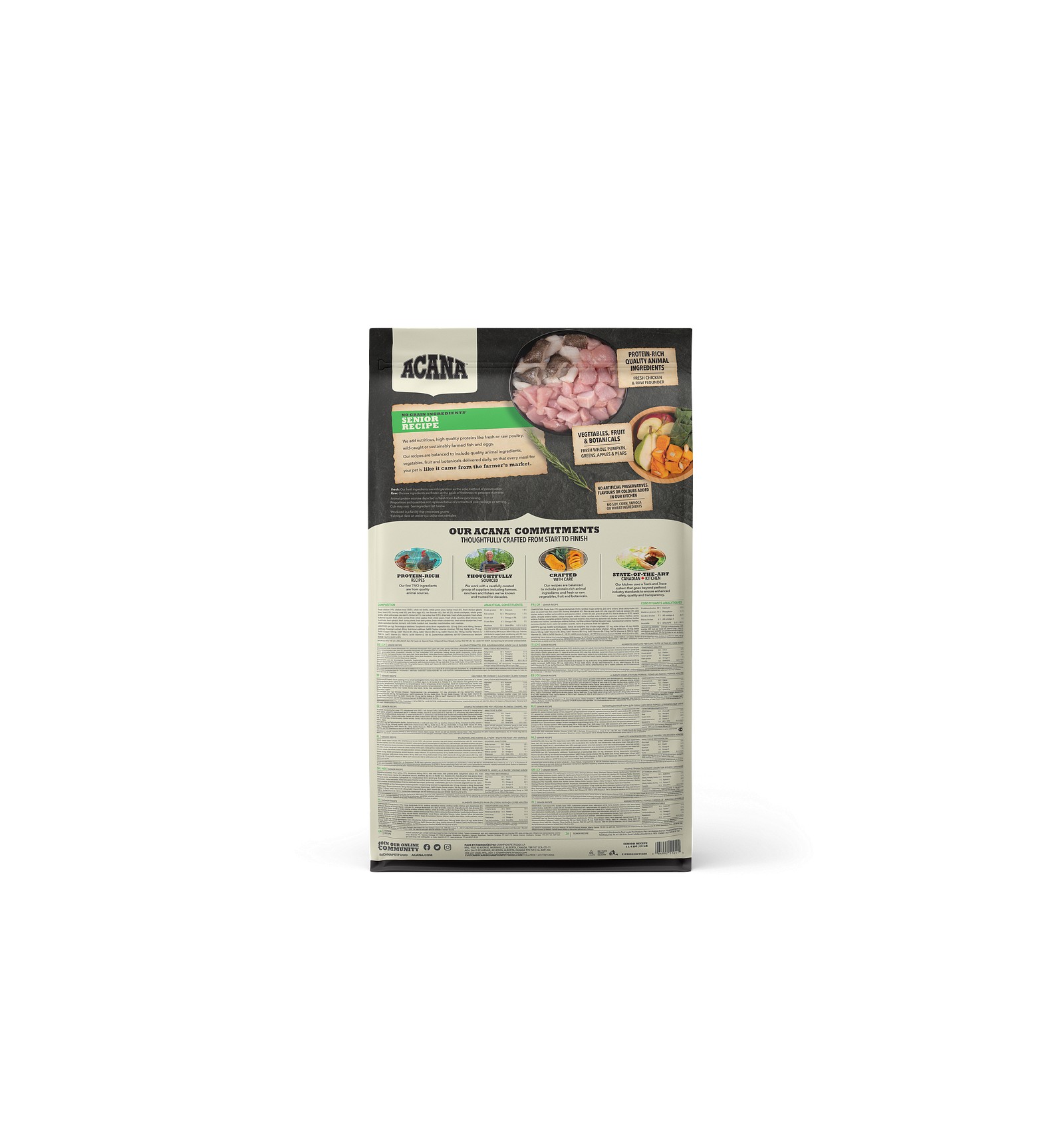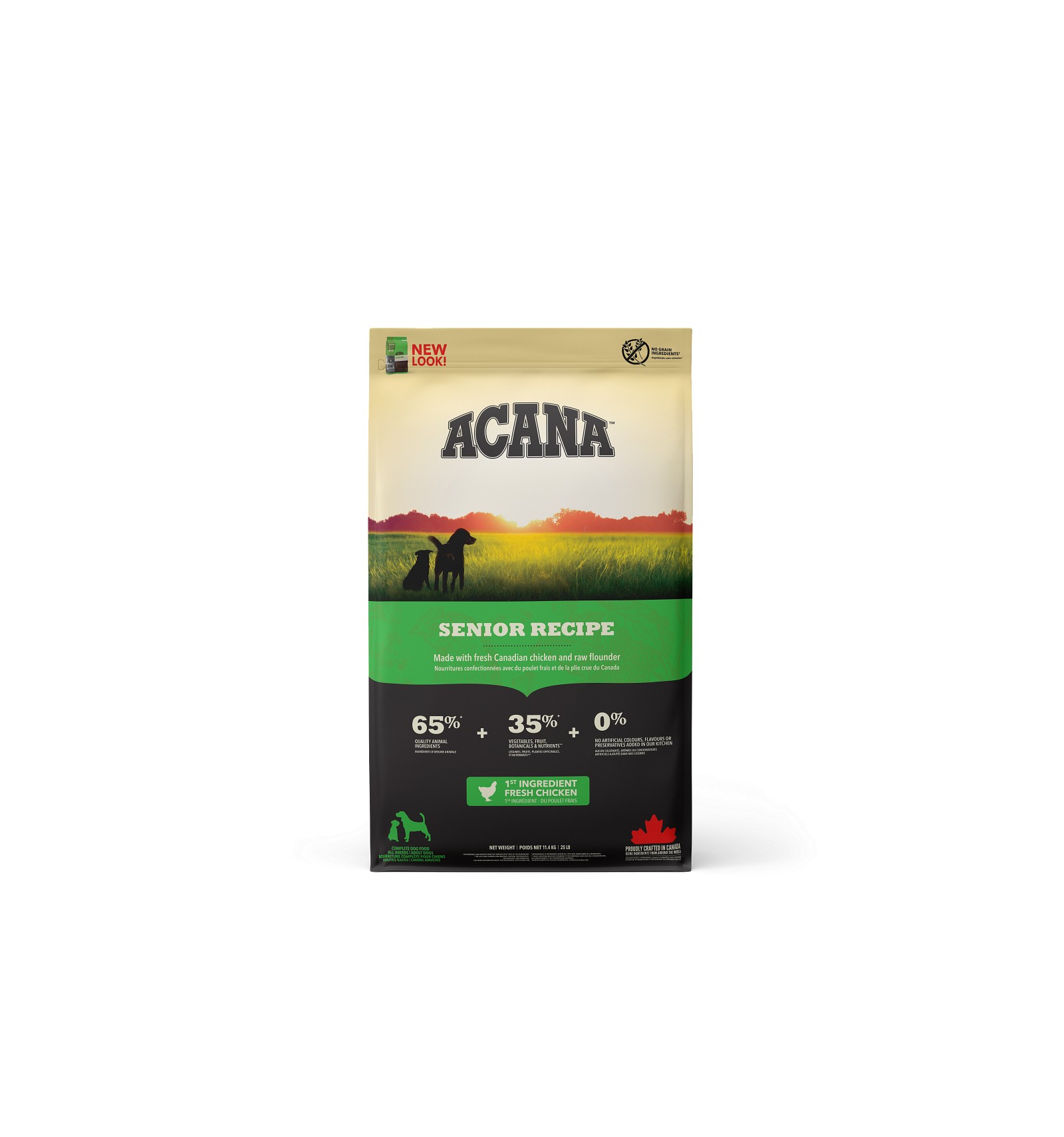 ACANA Senior é um alimento completo para cães que contém níveis mais elevados de proteínas provenientes de frango, peru, pescada e ovos frescos, incluindo carne, órgãos e ossos, fornecendo todos os nutrientes necessários para manter músculos e ossos fortes.