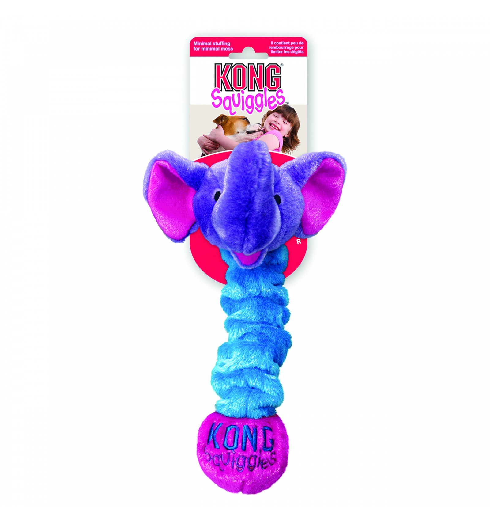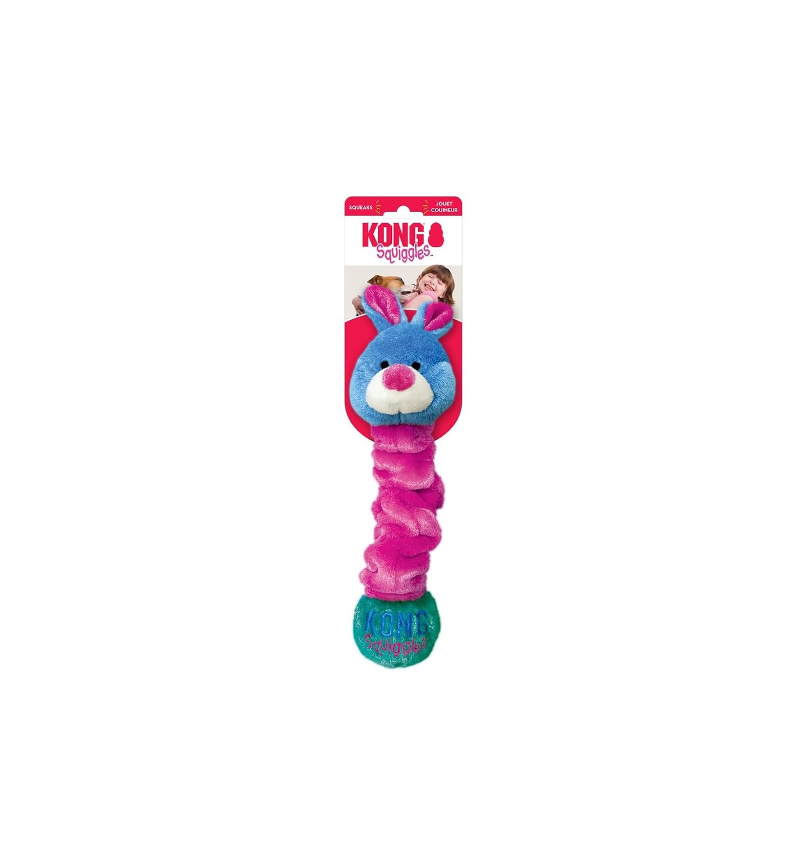 Peluche Elástico Kong Squiggles com som nas extremidades, com cores vivas e um divertido design em forma de animal (burro, elefante, macaco e o coelho).