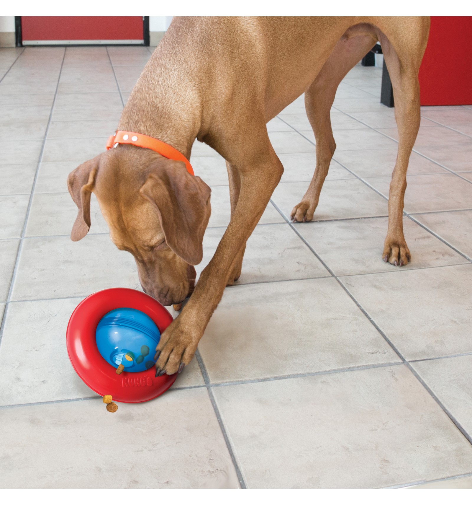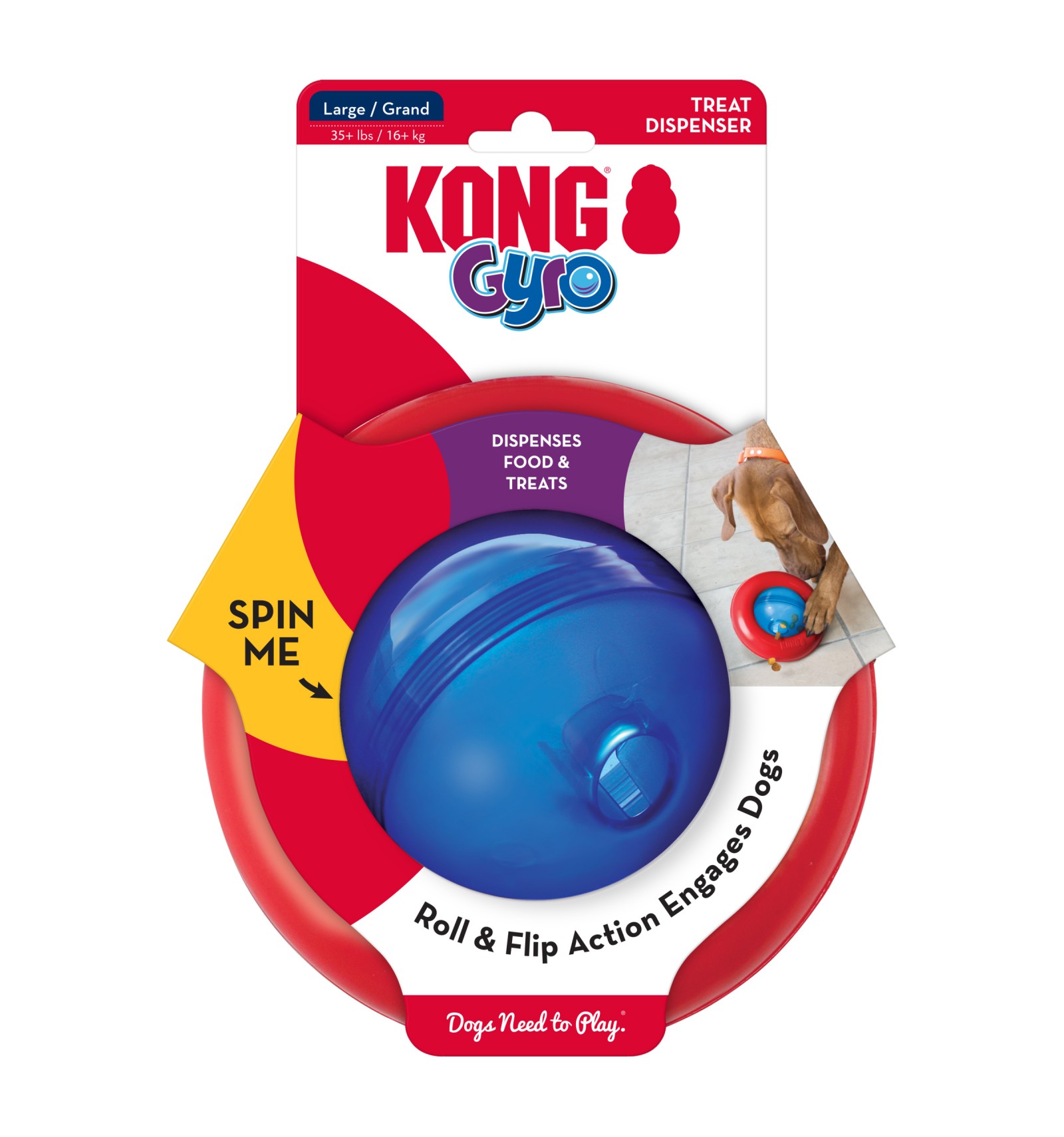 O KONG Gyro certamente vai entrar com um irresistível movimento de rolar e virar mantendo os cães estimulados e intrigados. Com o globo giratório central e o anel externo estático, este brinquedo dinâmico incentiva os cães a empurrar, dar patadas e rolar o GYRO, distribuindo petiscos deliciosamente saborosos pelo caminho. Ideal para brincadeiras independentes, recheie com lanches ou ração para prolongar a brincadeira e maior diversão. Disponível em tamanhos grandes e pequenos.