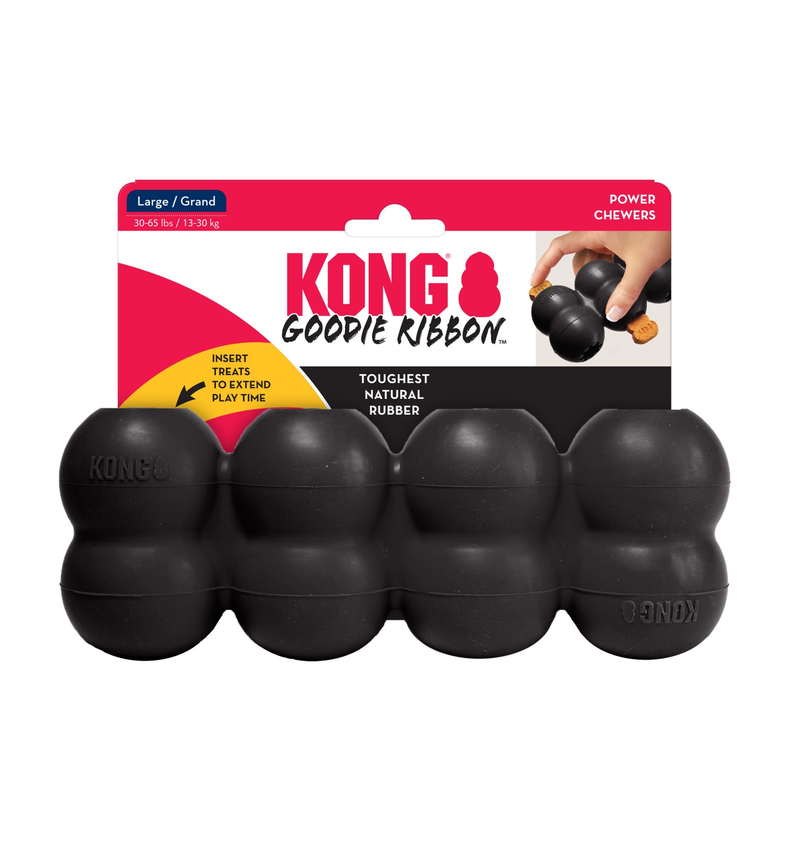 Um verdadeiro tesouro de mastigar! Um exclusivo formato de osso e a borracha KONG Extreme durável satisfazem e recompensam os instintos naturais de mastigação, enquanto proporcionam uma solução duradoura que mantém os cães entretidos. Com os quatro espaços do KONG Extreme Goodie Ribbon para rechear e os sulcos do Goodie Gripper™ no seu interior, a procura pelos petiscos tornar-se-á um delicioso desafio mental para os cães. Ideal para rechear com KONG Easy Treat, KONG Snacks ou a ração preferida do seu cão.