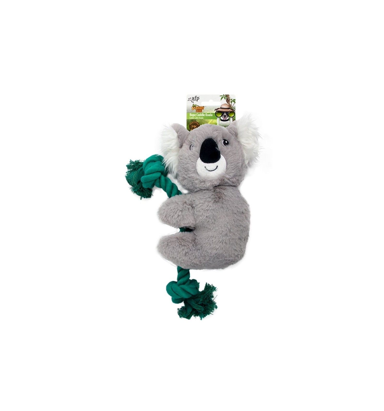 Brinquedo de peluche em forma de coala para cães com corda nos membros.