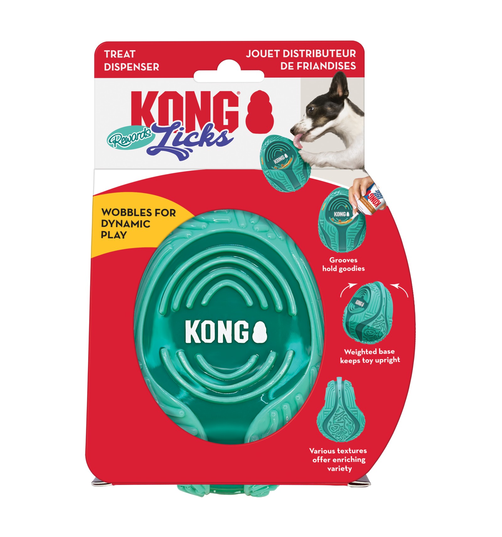KONG Licks Rewards é mais divertido e desafiador do que um tapete para lamber - com uma base pesada que ajuda o brinquedo a balançar para uma brincadeira dinâmica.