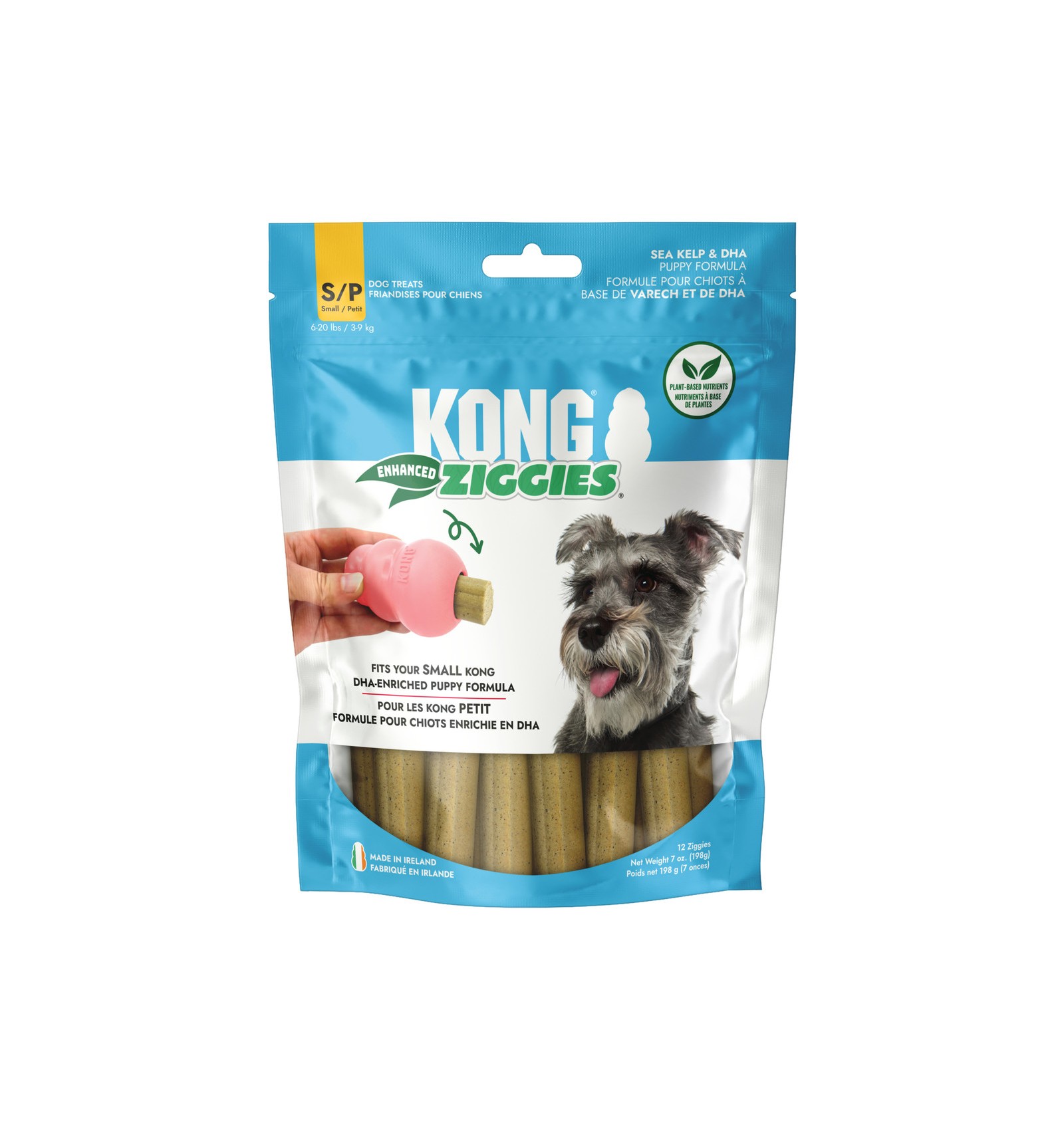 KONG Ziggies Enhanced Puppy são mastigações naturalmente deliciosas que suportam a saúde bucal do seu filhote. Essas guloseimas de filhote podem ajudar a prevenir o acúmulo de placa bacteriana e promover o hálito fresco, satisfazendo seus instintos de mastigação. Enriquecido com DHA e alga marinha, Ziggies Enhanced Puppy contém importantes antioxidantes, vitaminas, minerais e proteínas. Ziggies são maravilhosos por conta própria ou podem ser usados para rechear dentro de Puppy KONGs e KONG Tires. Além disso, essas guloseimas à base de plantas são livres de trigo, milho e soja, caso seu filhote tenha alergias específicas. Você pode ajudar seu filhote a aliviar sua dor de dentição, dando-lhes um KONG recheado com Ziggies Enhanced Puppy e cobrindo-o com Easy Treat!