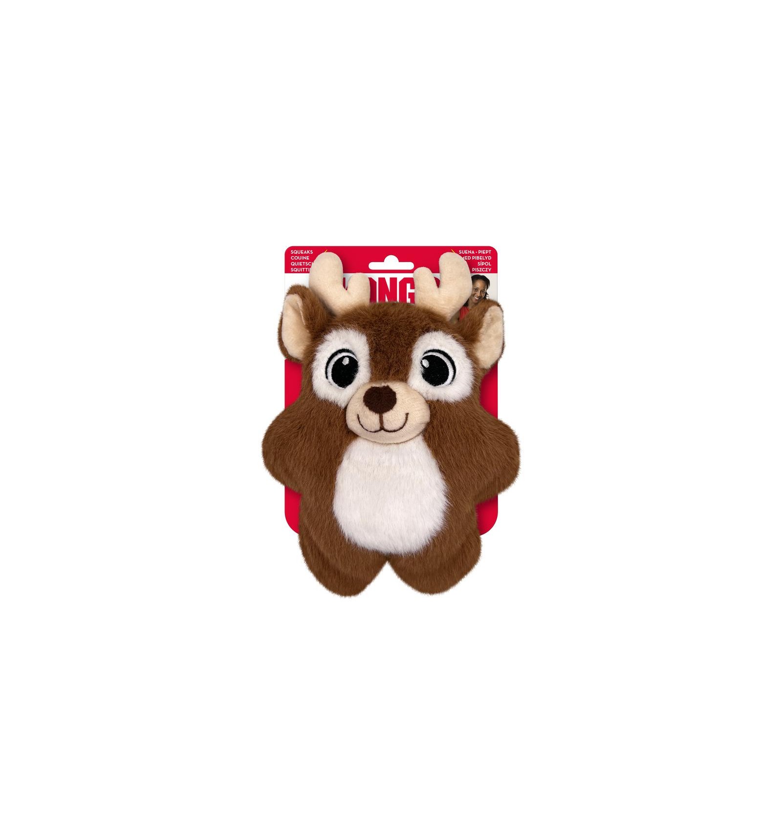 KONG Snuzzles rena são cheios de diversão com um apito no corpo inteiro que produz com um som prolongado e alto. O exterior de pelúcia de altíssima qualidade prolonga a diversão e, ao mesmo tempo, satisfaz o comportamento instintivo de mastigar. A densa sensação na boca continua o envolvimento, recompensando o jogo apropriado com cada mordida. Ideal para brincar em ambientes fechados, o formato achatado garante o envolvimento dos cães de todos os tamanhos.