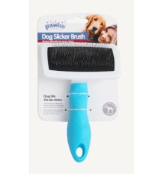 A escova para cães possui pinos de metal curvos e lisos para desembaraçar e remover pelos mortos. Ideal para pelagens pequenas a médias sensíveis!