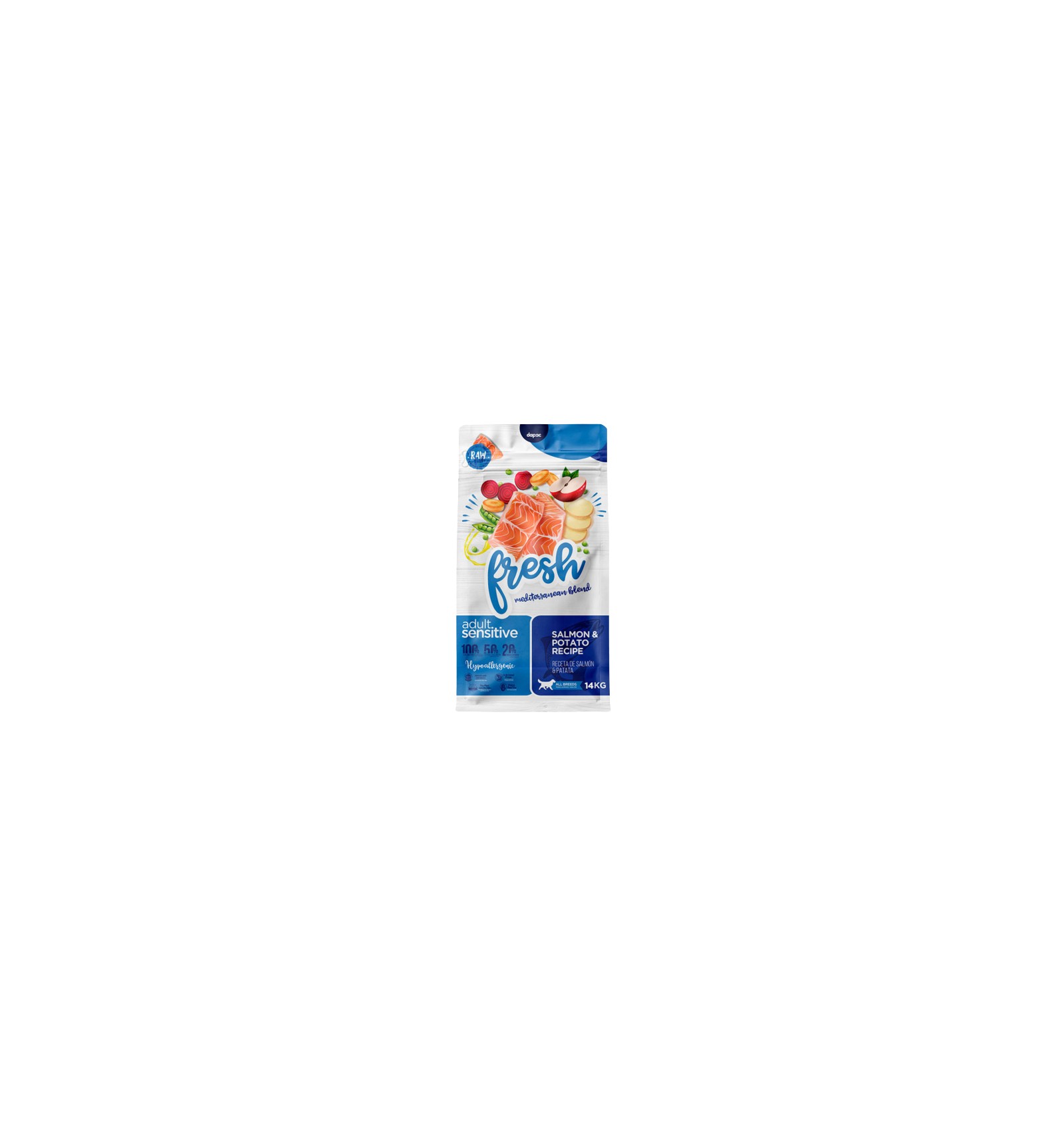 O salmão é o ingrediente principal do Fresh Sensitive, e por isso, reúne todas as propriedades desse alimento: reduz o colesterol, melhora os triglicerídeos, previne o aparecimento de problemas nas articulações e fortalece a pelagem e o pelo.