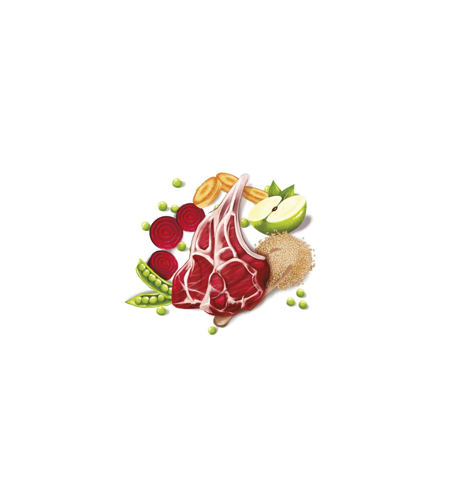 Carne de cordeiro desidratada. Carne de cordeiro fresca 20%*. Milho*. Arroz integral 12,5%*. Cevada*. Ervilhas 6%*. Óleo de frango (fonte de ácidos graxos ômega 6). Produtos de fermentação (proteína de alta digestibilidade). Maçã 2,5%*. Hidrolisado de fígado de cordeiro (digestão - maior palatabilidade). Beterraba 2,1%*. Proteína de arroz. Levedura (fonte de MOS) 1%*. Linhaça*. Cenoura 1%*. Óleo de peixe. Azeite de oliva 0,5%*. Chicória (fonte de FOS) 0,2%*. Yucca schidigera*.