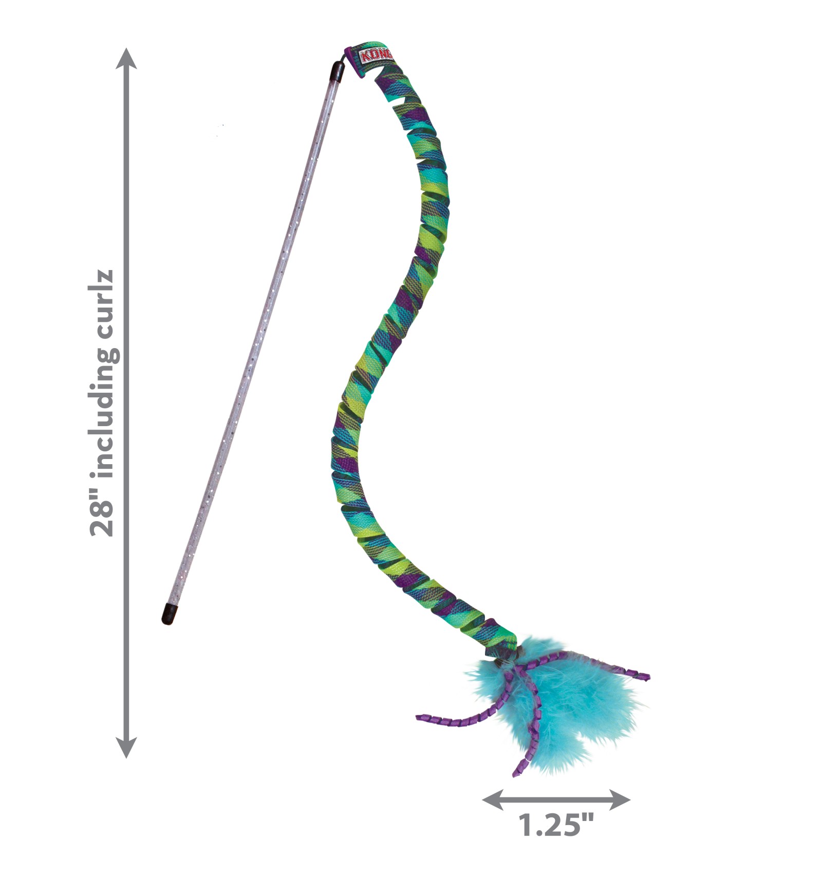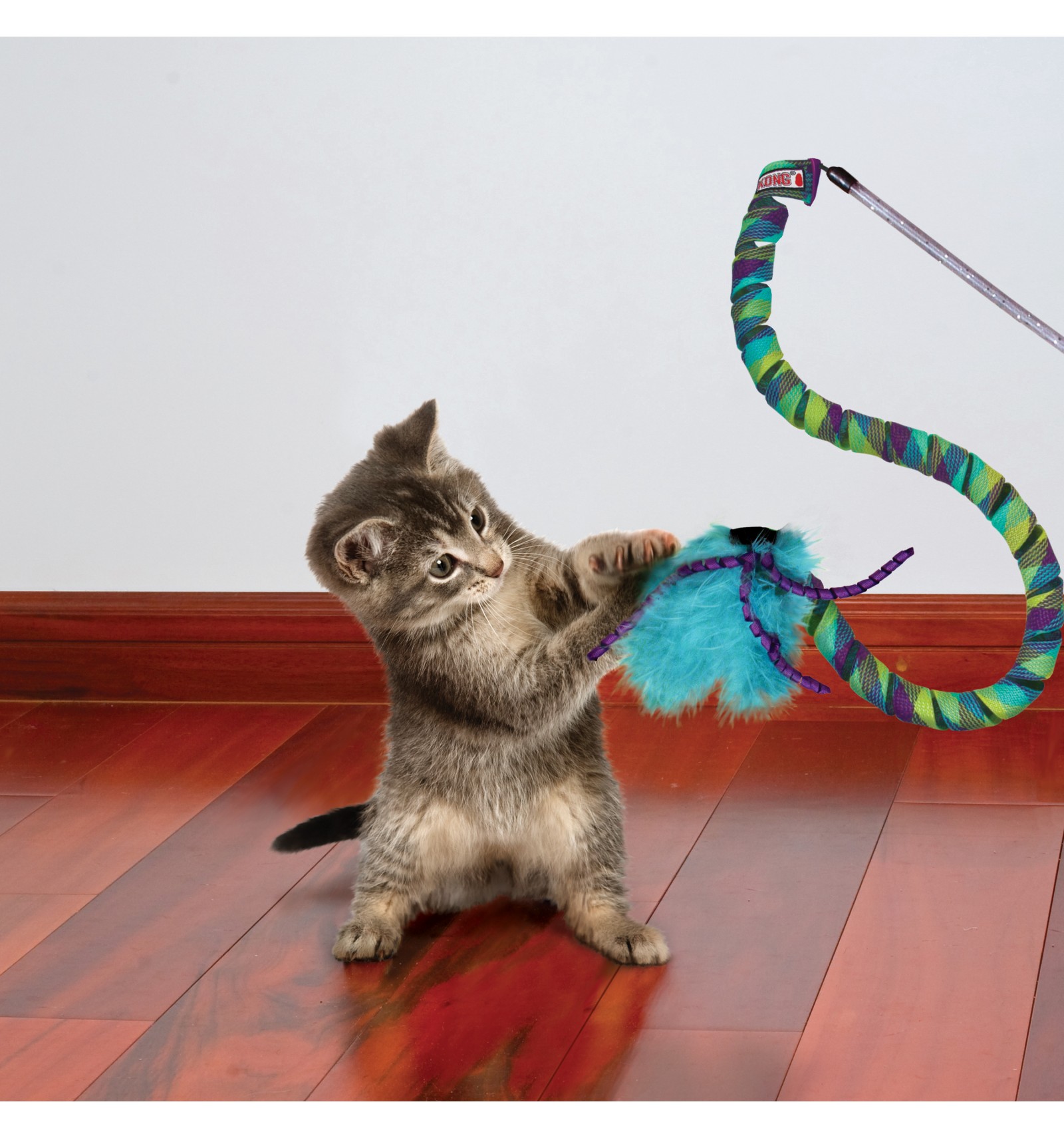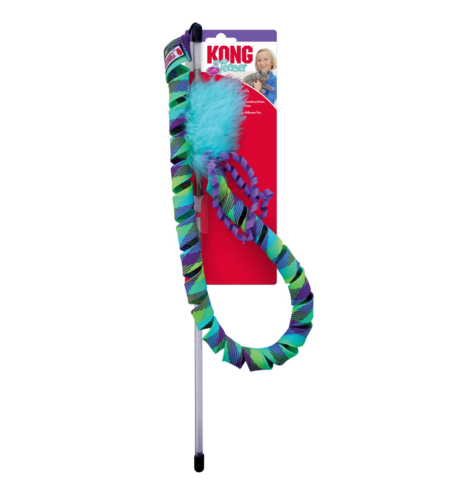 Kong Teaser Curlz, significa que quando o gato se lança sobre o alvo da pena e fita, ele é recompensado com mais ação através de um salto selvagem de alta velocidade, proporcionando-lhe mais diversão.
