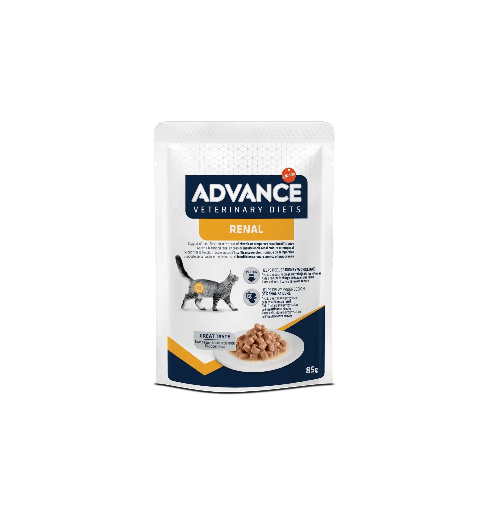 ADVANCE VETERINARY DIETS FELINE RENAL é um alimento dietético completo para gatos adultos, com um teor restrito de proteína, mas de qualidade elevada, e com baixo teor de fósforo, indicado para o apoio à função renal em caso de insuficiência renal crónica ou aguda