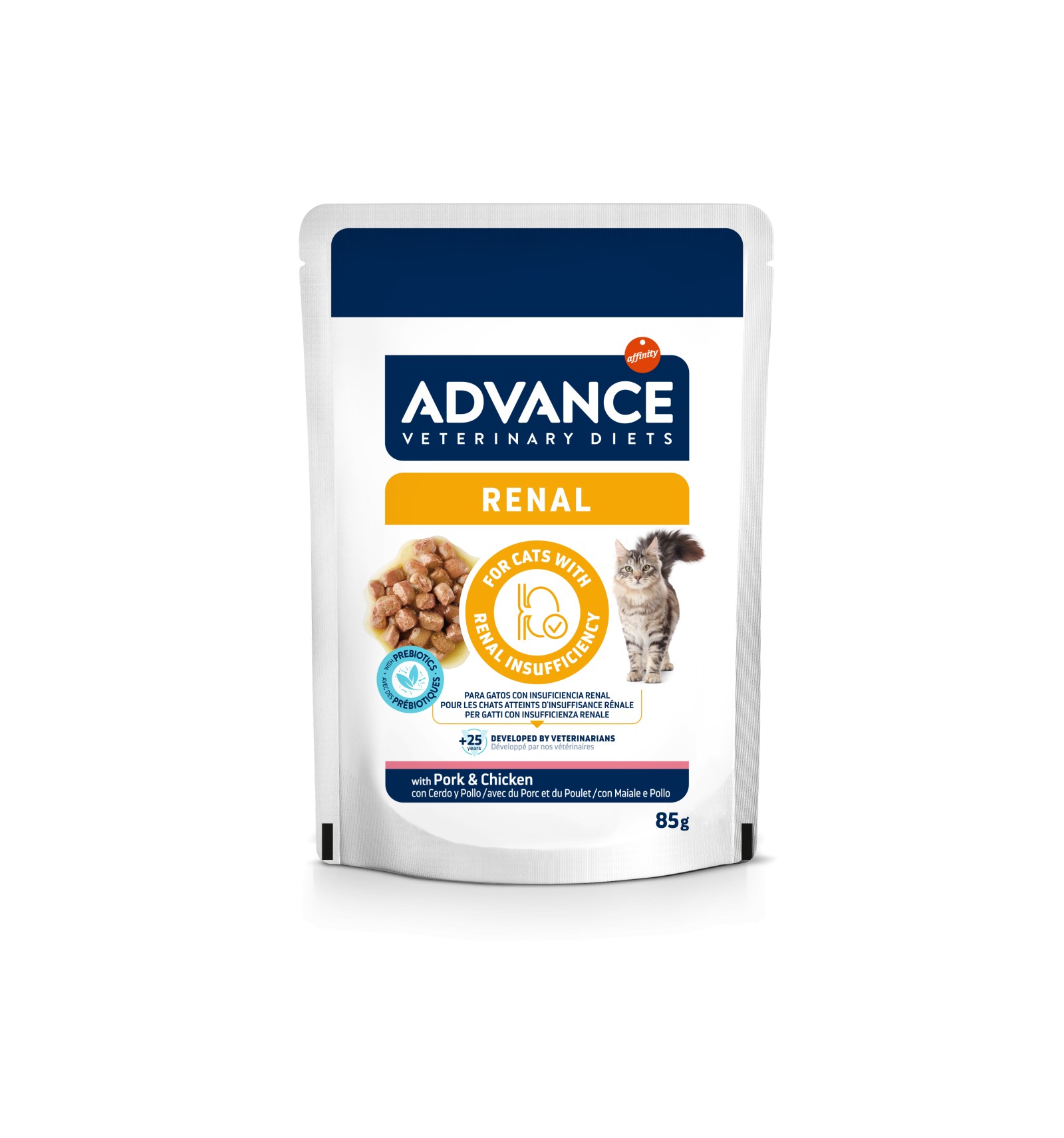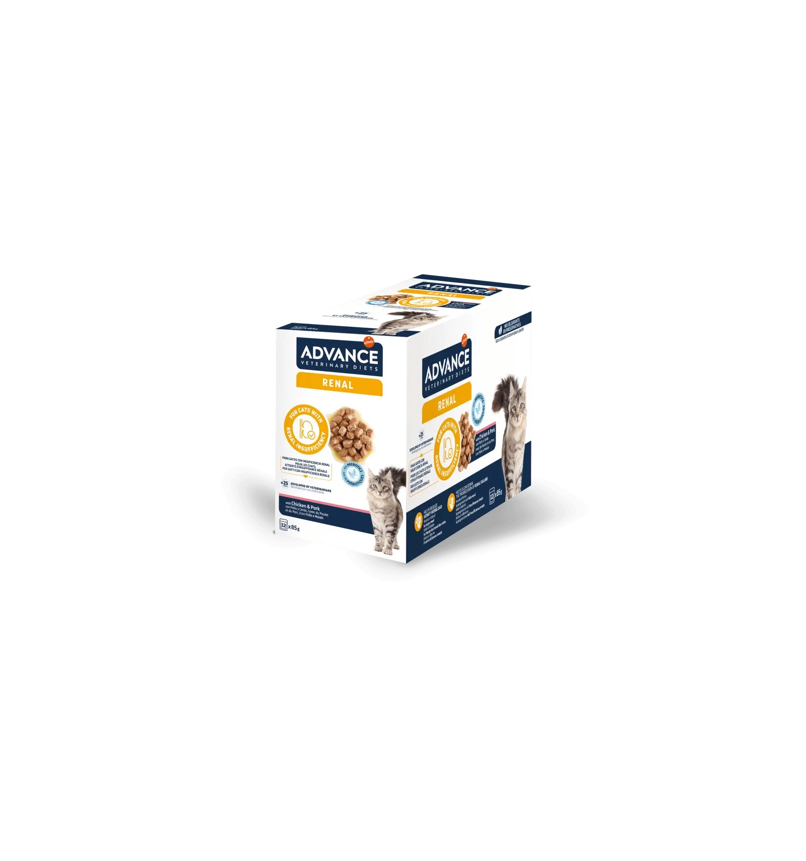 ADVANCE VETERINARY DIETS FELINE RENAL é um alimento dietético completo para gatos adultos, com um teor restrito de proteína, mas de qualidade elevada, e com baixo teor de fósforo, indicado para o apoio à função renal em caso de insuficiência renal crónica ou aguda
