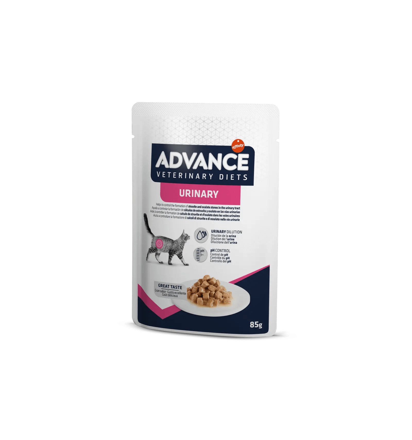ADVANCE VETERINARY DIETS FELINE URINARY é um alimento dietético completo para gatos adultos, formulado com propriedades de subsaturação da urina para a estruvite, propriedades de acidificação da urina e teor reduzido de magnésio, indicado para a dissolução dos cálculos de estruvite e a redução da recorrência de cálculos de estruvite