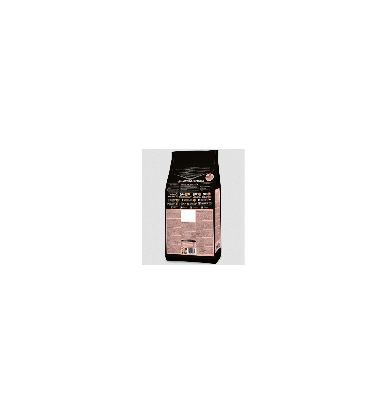 Proteína: 34 %, teor de matéria gorda: 17 %, fibra bruta: 3 %, matéria inorgânica: 7 %, humidade: 8 %, ómega 6: 2,5 %, ómega 3: 0,6 %, cálcio: 0,8 %, fósforo: 0,8 %. Energia metabolizável: 4.030 kcal/kg.