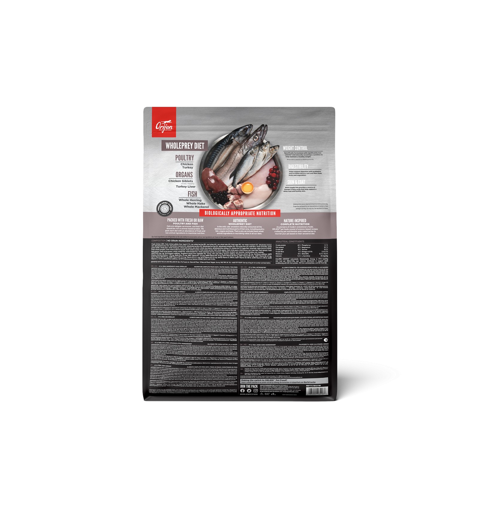 Frango fresco (14%), ovos inteiros frescos (6%), arenque inteiro fresco (6%), peru fresco (6%), fígado de frango fresco (6%), linguado inteiro fresco (4%), cavala inteira fresca (4%), pescada do pacífco inteira fresca (4%), fígado de peru fresco (4%), coração de frango fresco (4%), frango desidratado (4%), peru desidratado (4%), cavala inteira desidratada (4%), sardinha inteira desidratada (4%), arenque inteiro desidratado (4%), escamudo do Alasca desidratado (4%), fibra de lentilha, lentilhas vermelhas inteiras, lentilhas verdes inteiras, ervilhas verdes com vagem, grão-de-bico, ervilhas amarelas inteiras, feijão catarino inteiro, feijão branco inteiro, cartilagem de frango desidratado (1%), coração de peru fresco (1%), verdinho inteiro desidratado (1%), gordura de frango (0,5%), fibra de maçã, alga desidratada (fonte de DHA e EPA), abóbora inteira desidratada, abóbora-almiscarada inteira desidratada, cenouras desidratadas, fígado de frango liofilizado, fígado de peru liofilizado, abóbora fresca inteira, abóbora-almiscarada fresca inteira, curgete fresca inteira, pastinaca fresca inteira, cenouras frescas, maçãs Red Delicious inteiras frescas, peras Bartlett inteiras frescas, couve fresca, espinafres frescos, folhas de beterraba frescas, nabos frescos, alga laminária castanha, arandos inteiros, mirtilos inteiros, bagas de saskatoon inteiras, raiz de chicória, açafrão-das-índias, cardo-mariano, raiz de bardana, alfazema, raiz de alteia, roseira-silvestre.