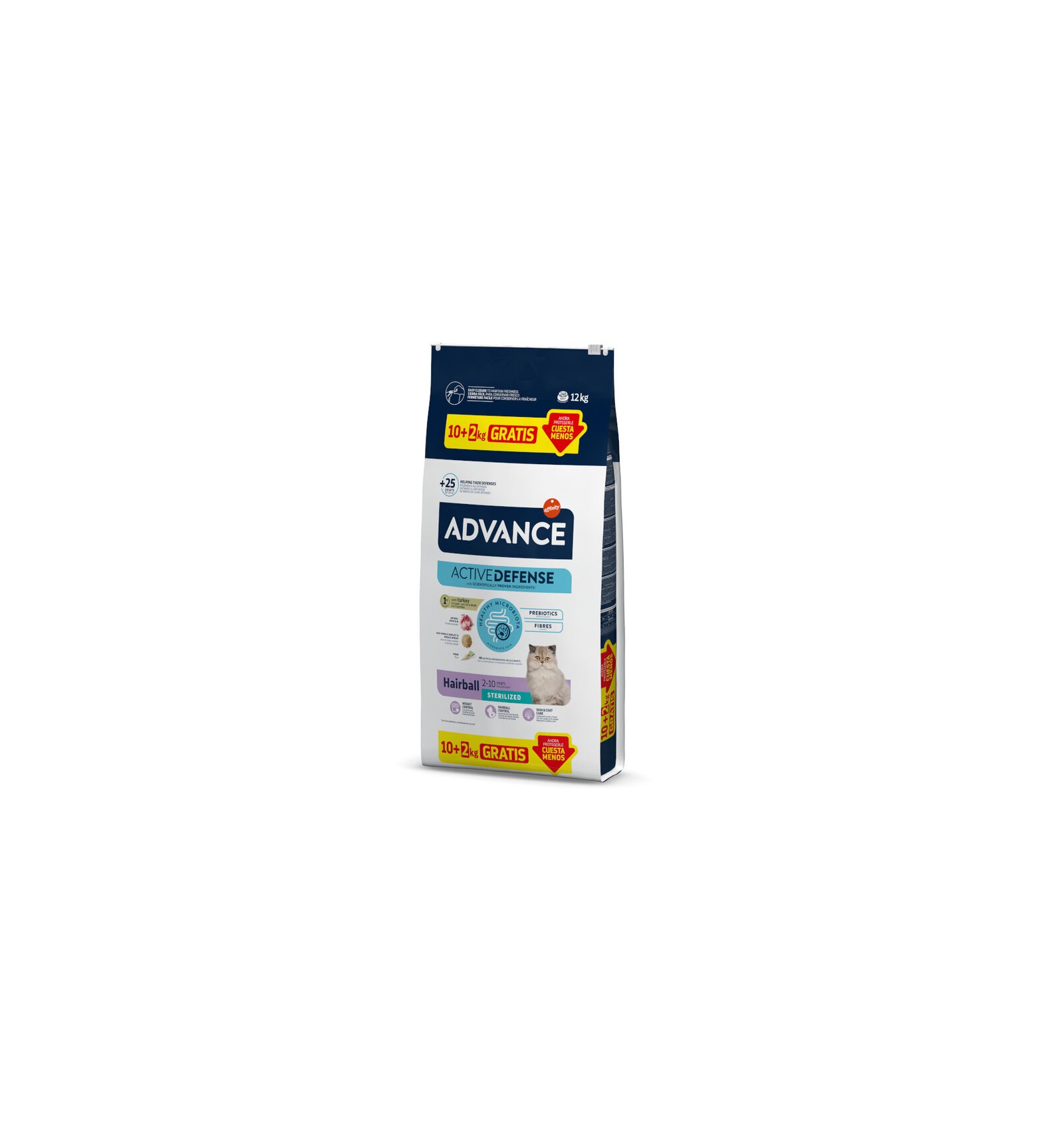 Advance Sterilized Adult Hairball é especialmente indicado para ajudar a controlar as bolas de pelo em gatos adultos esterilizados. Graças ao elevado teor de fibra, facilita a eliminação de pêlo e, portanto, ajuda a reduzir a formação de bolas de pêlo. Também ajuda a controlar o peso porque tem um índice moderado de gorduras e calorias e controla o pH urinário porque contém níveis equilibrados de minerais. Além disso, contribui para o cuidado da pele e do pelo graças aos ácidos gordos ómega 3 e ómega 6 e ao zinco. O tamanho do croquete adapta-se à mandíbula dos gatos adultos.