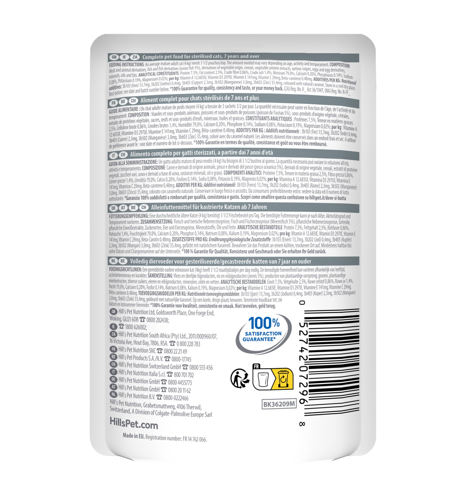 Hill's Science Plan Sterilised Cat alimento húmido para gato adulto maturo com peixe do oceano é um alimento completo para gatos esterilizados com sete ou mais anos de idade.
