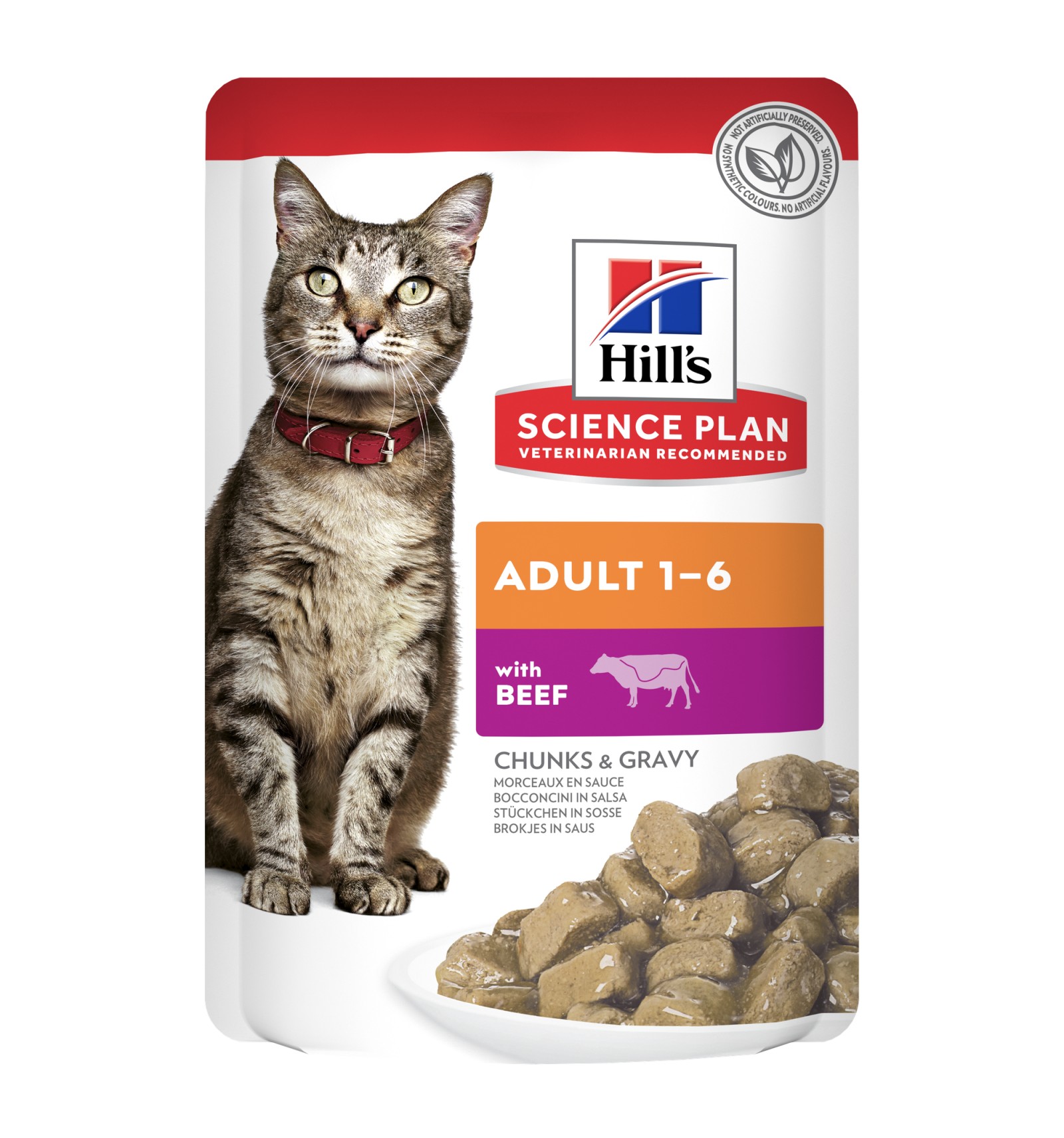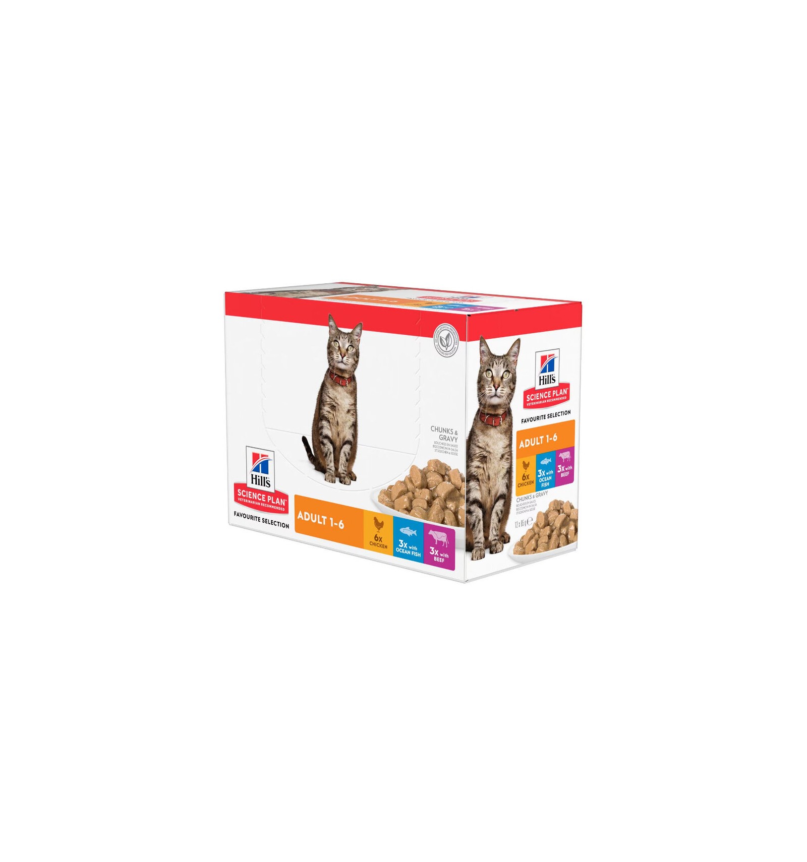 O seu gato adorará o sabor de Hill's Science Plan alimento para gato adulto com pedaços suaves de frango, peixe do oceano e carne de vaca em molho. Contém o equilíbrio ideal entre o sabor e a nutrição e é especialmente formulado para atender às necessidades energéticas dos gatos durante o auge da sua vida. Elaborado com ingredientes de elevada qualidade e de fácil digestão.