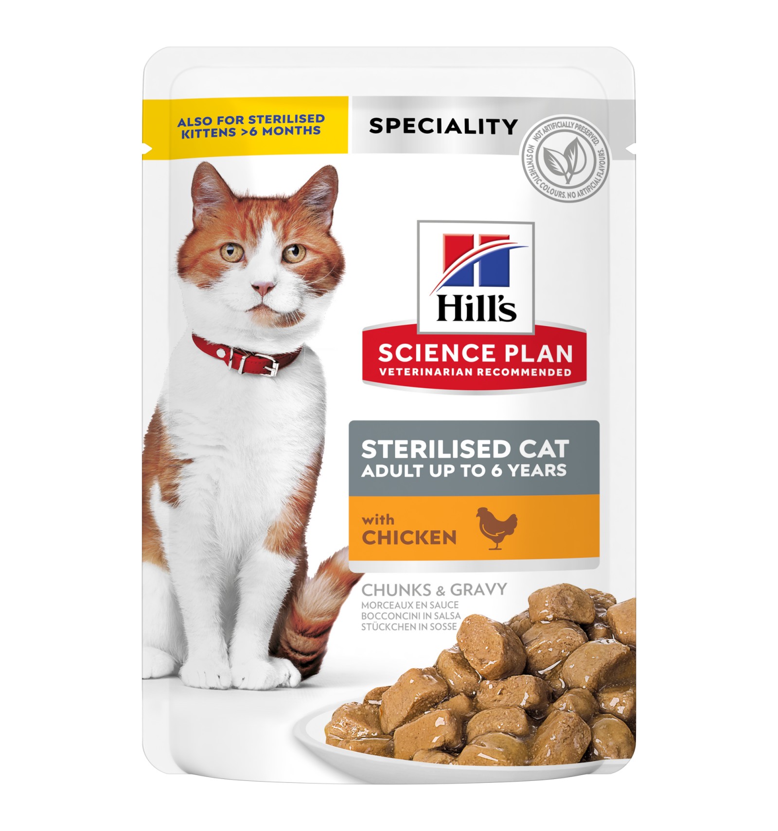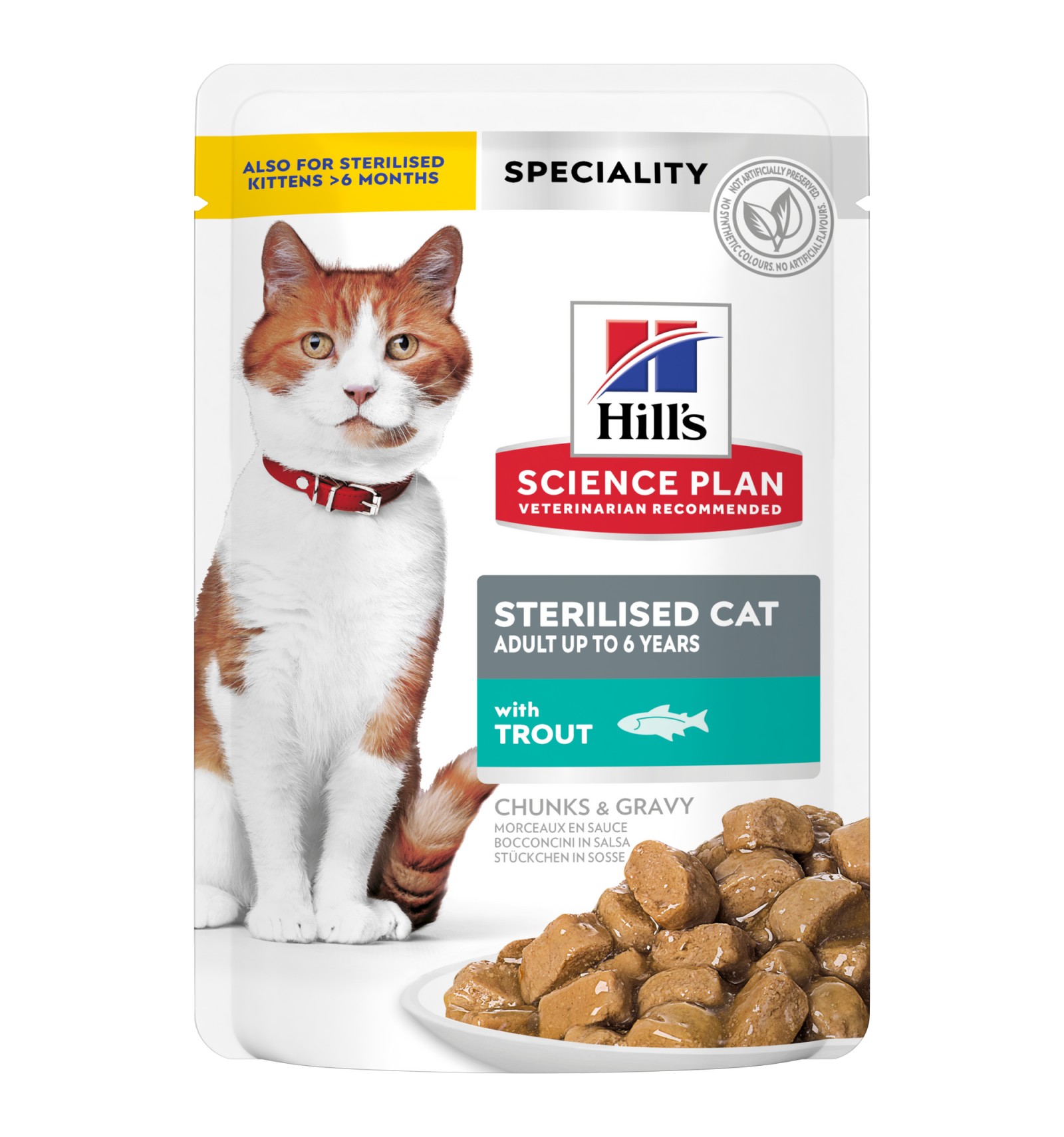 O seu gato adorará o sabor de Hill's Science Plan Sterilised Cat alimento para gato adulto com pedaços suaves de frango, salmão, perú e truta em molho. Contém o equilíbrio ideal entre o sabor e a nutrição e tem uma fórmula única de controlo de peso para ajudar os gatos esterilizados a manterem-se em forma. Elaborado com ingredientes de elevada qualidade e de fácil digestão.