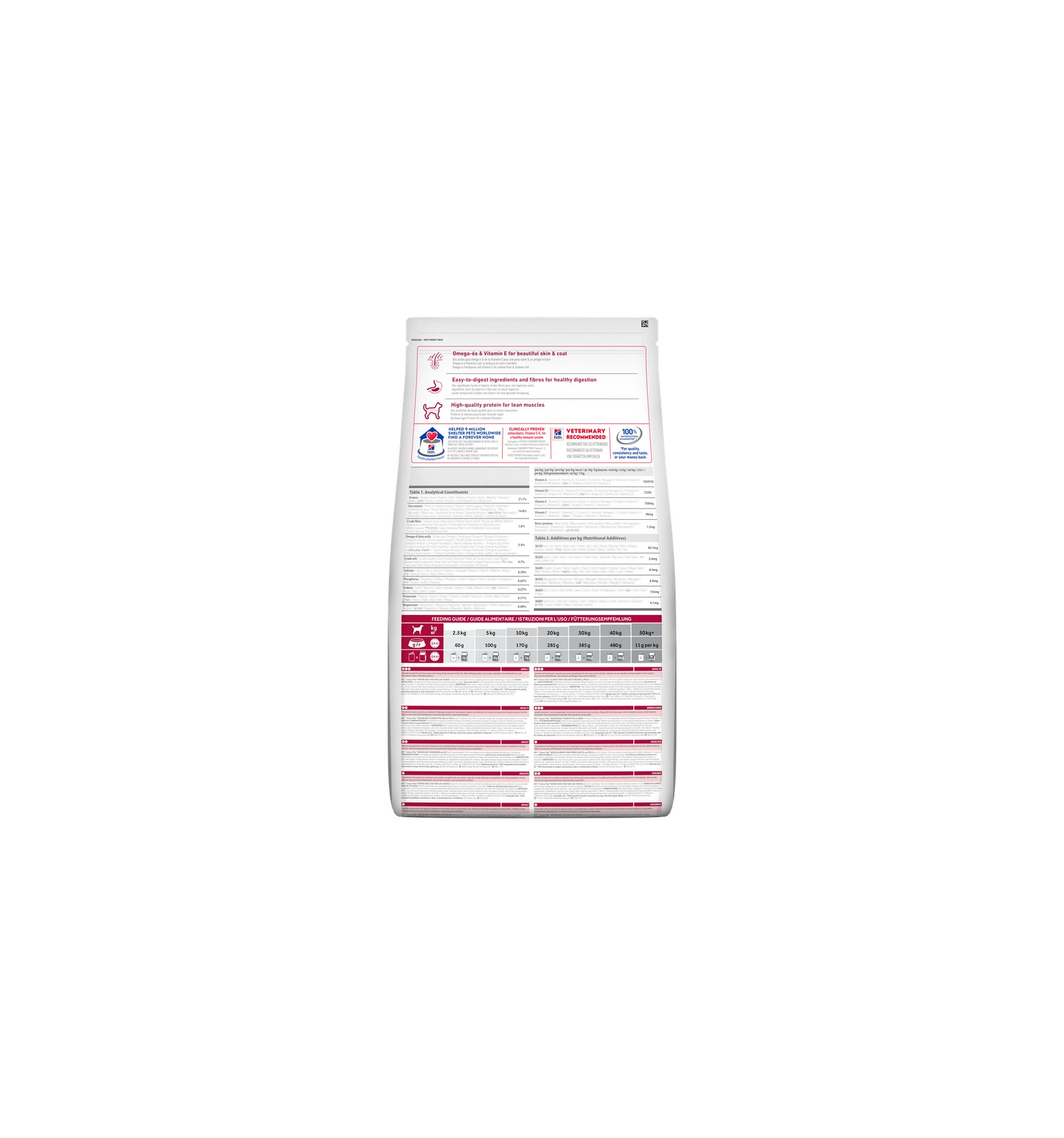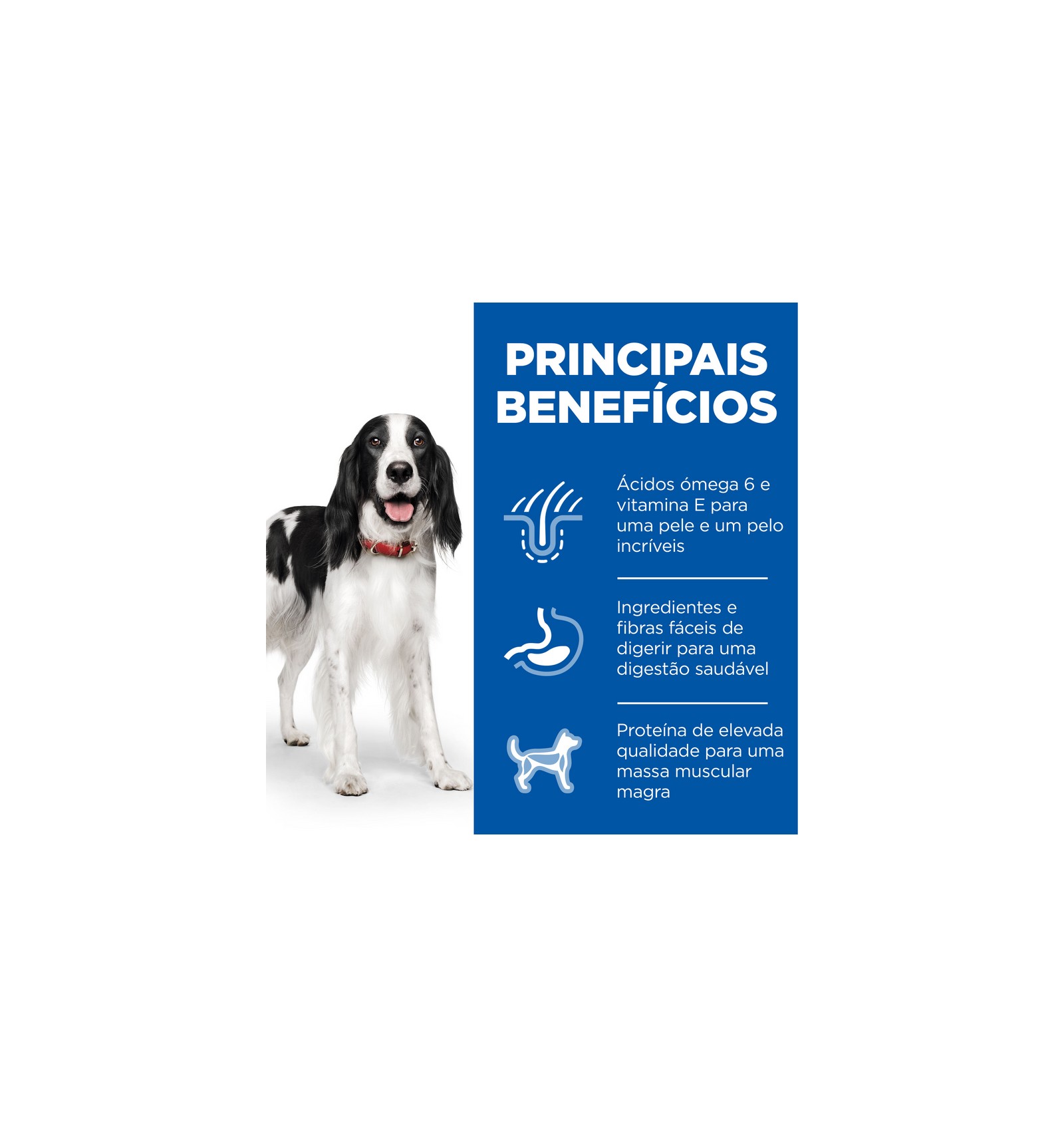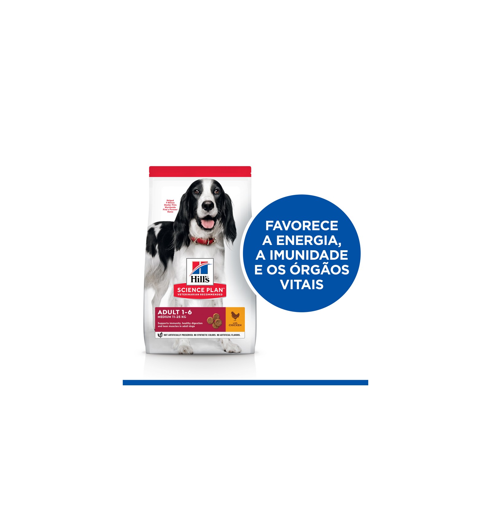Hill's Science Plan alimento para cão adulto de raça média com frango (frango 9%; total aves 14%) é um alimento completo para cães adultos de raça média com 1 a 6 anos de idade.