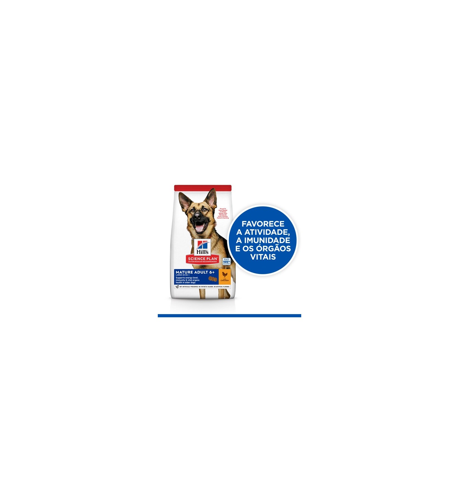 Hill's Science Plan alimento para cão adulto maturo de raça grande com frango (frango 7%; total aves 11%) é um alimento completo para cães de raça grande/gigante com 6 ou mais anos de idade.