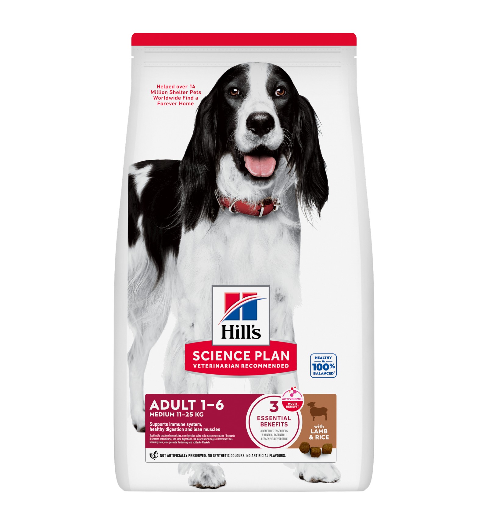 Hill's Science Plan alimento para cão adulto de raça média com borrego e arroz é um alimento completo especialmente formulado com a Tecnologia ActivBiome+ Multi-Benefit.