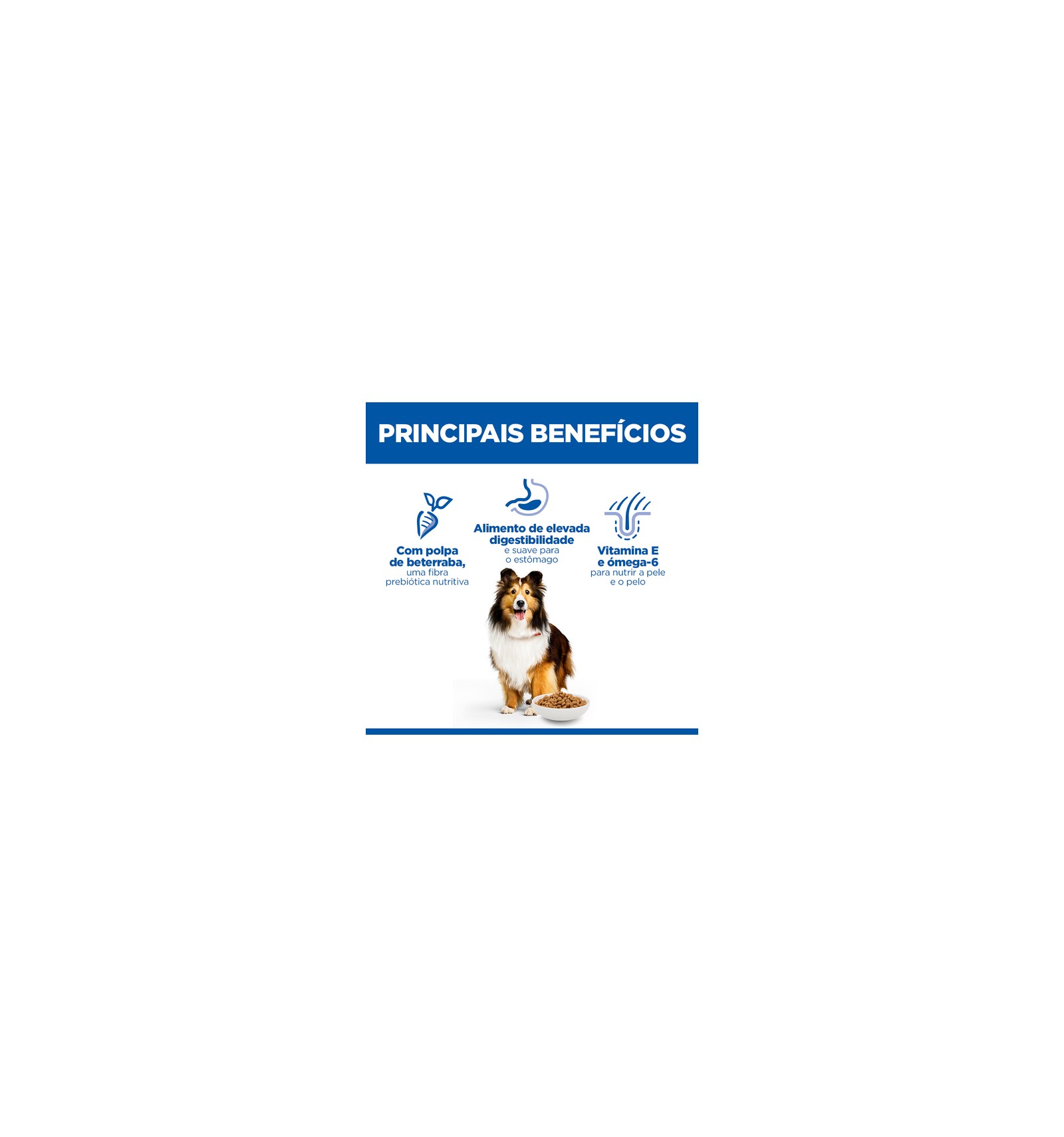 Hill's Science Plan Sensitive Stomach & Skin alimento para cão de raça média e grande com frango é um alimento completo para cães adultos para promover a saúde digestiva e o cuidado da pele.