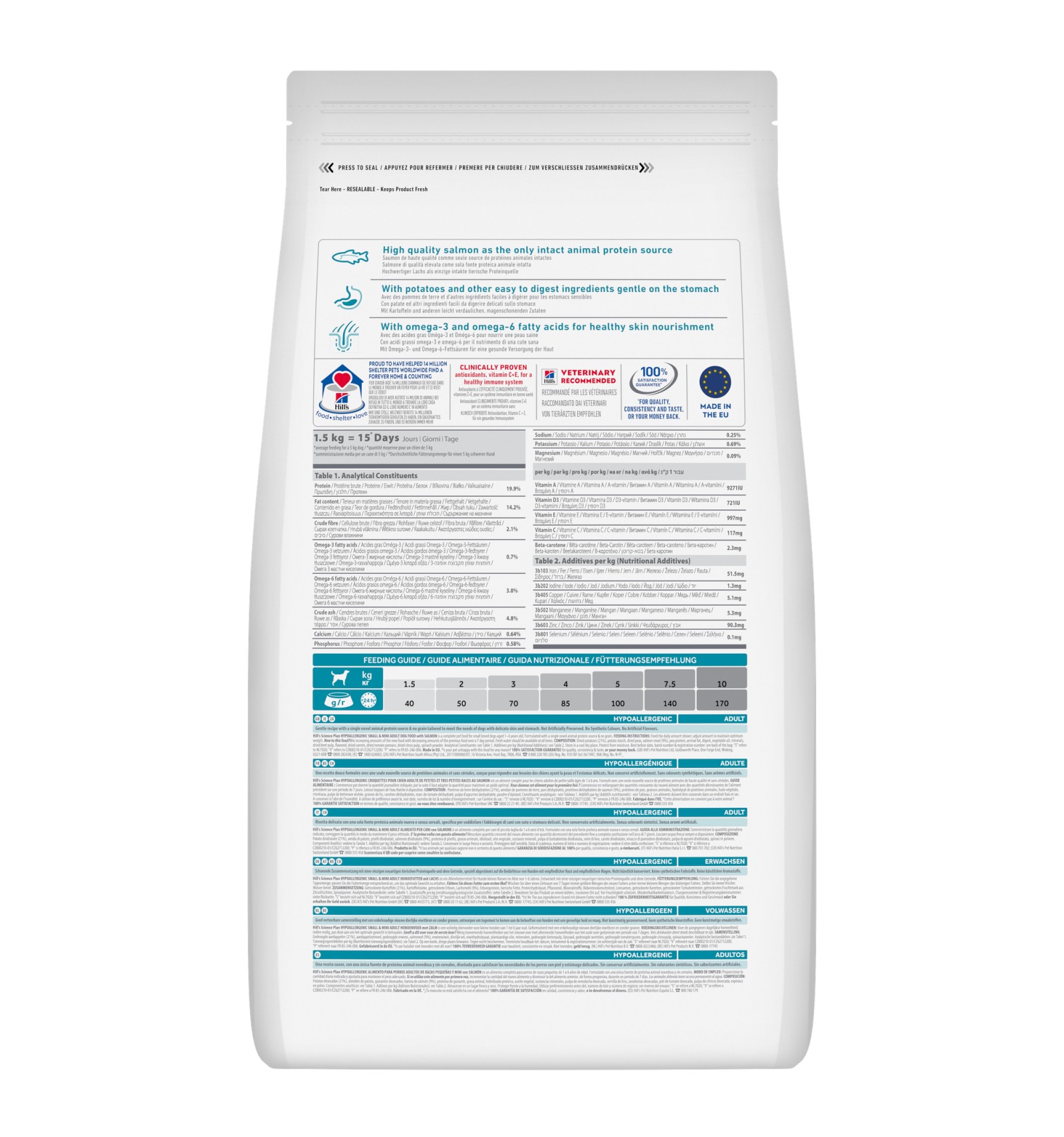 com salmão: batatas desidratadas (21%), amido de batata, ervilhas desidratadas, farinha de salmão (9%), proteína de ervilha, gordura animal, hidrolisado proteico, óleo de soja, substâncias minerais, polpa de beterraba desidratada, sementes de linho, cenouras desidratadas, vitaminas, polpa de tomate desidratada, polpa de citrinos desidratada, espinafre em pó, oligoelementos e betacaroteno. Com um antioxidante natural (mistura de tocoferóis).