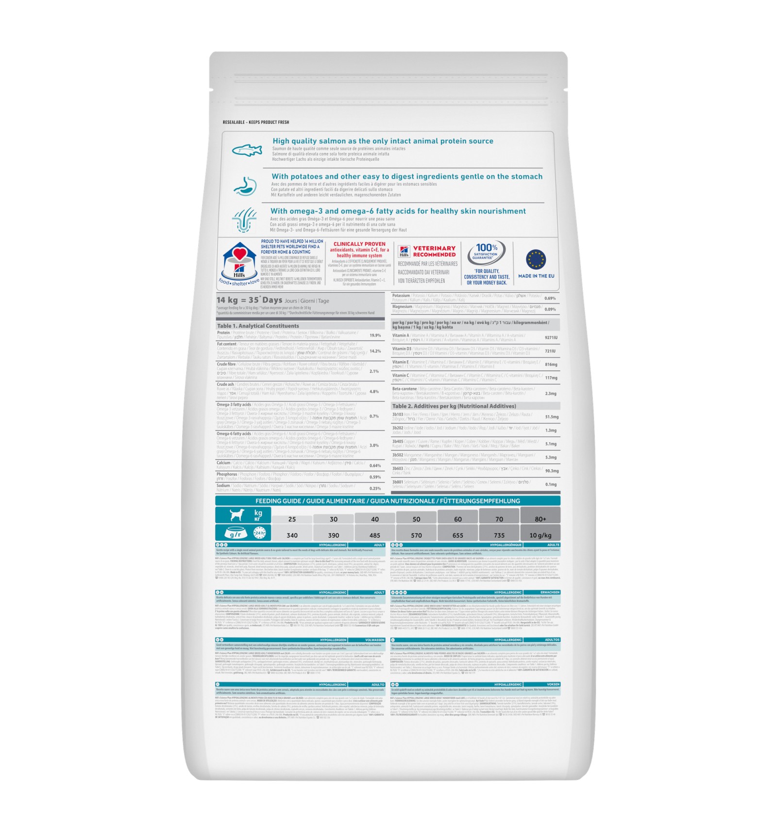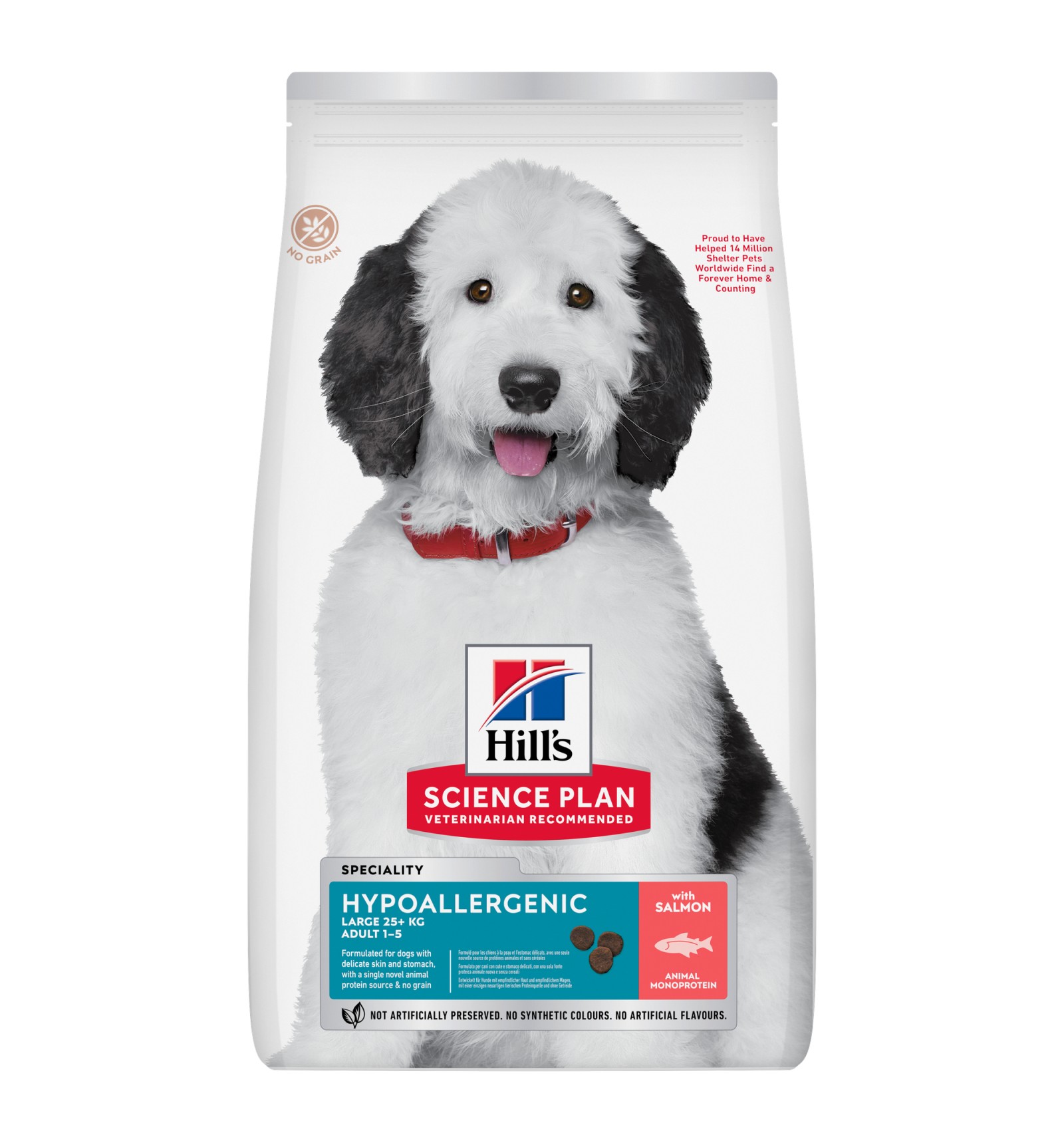 Hill's Science Plan Hypoallergenic alimento para cão adulto de raça grande com salmão é um alimento completo para cães de raça grande (25 kg+) com 1 a 5 anos de idade. Formulado com novas fontes de proteína limitadas de elevada qualidade e sem cereais.