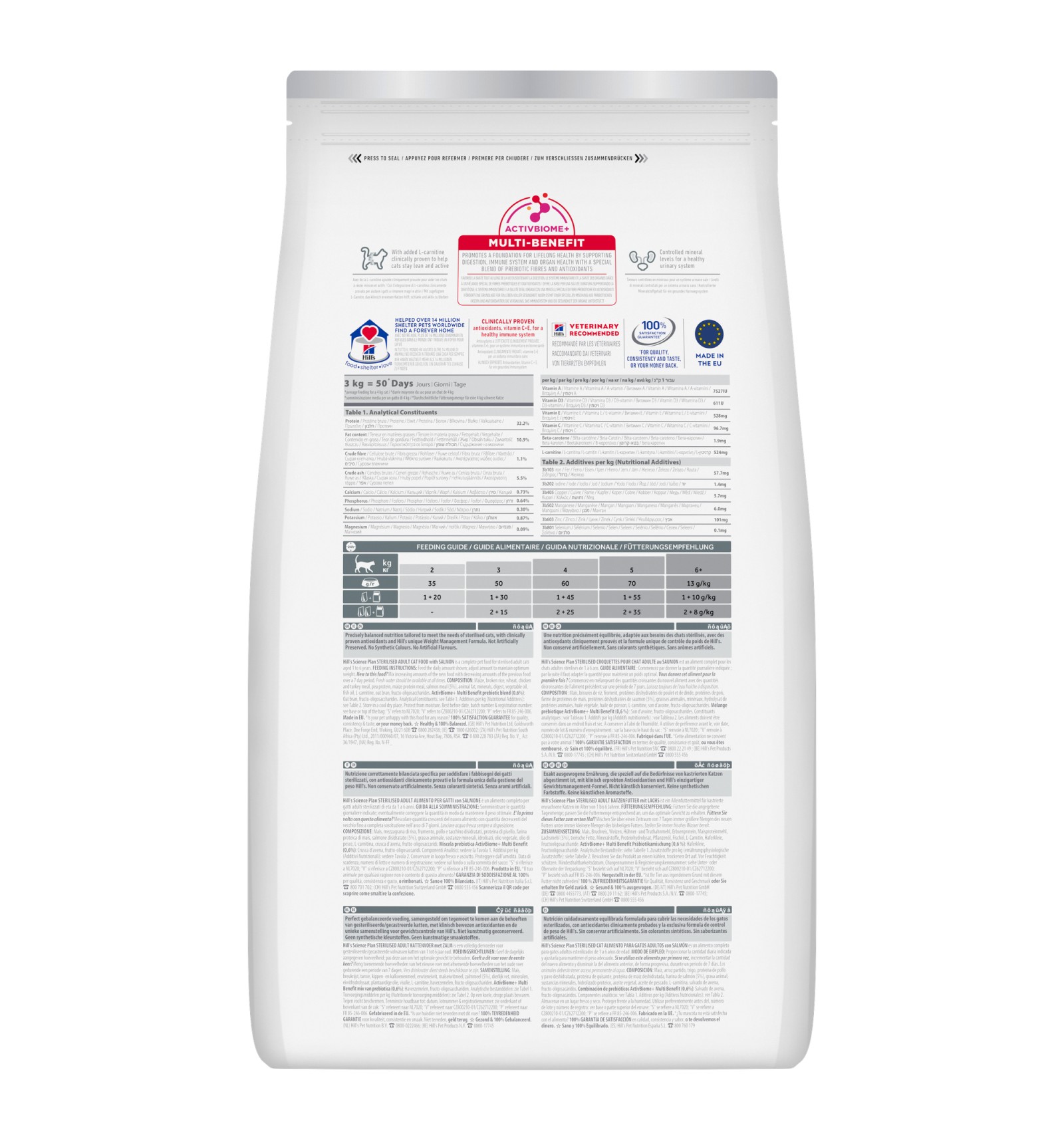 Hill's Science Plan Sterilised Cat alimento seco para gato adulto com salmão proporciona uma nutrição 100% saudável e equilibrada. Contém a Tecnologia ActivBiome+ Multi-Benefit, uma combinação de fibras prebióticas e antioxidantes, para promover a saúde digestiva e o bem-estar geral do seu gato ao longo da vida. Nutrição baseada na ciência para promover vidas longas e saudáveis. Principais benefícios:
