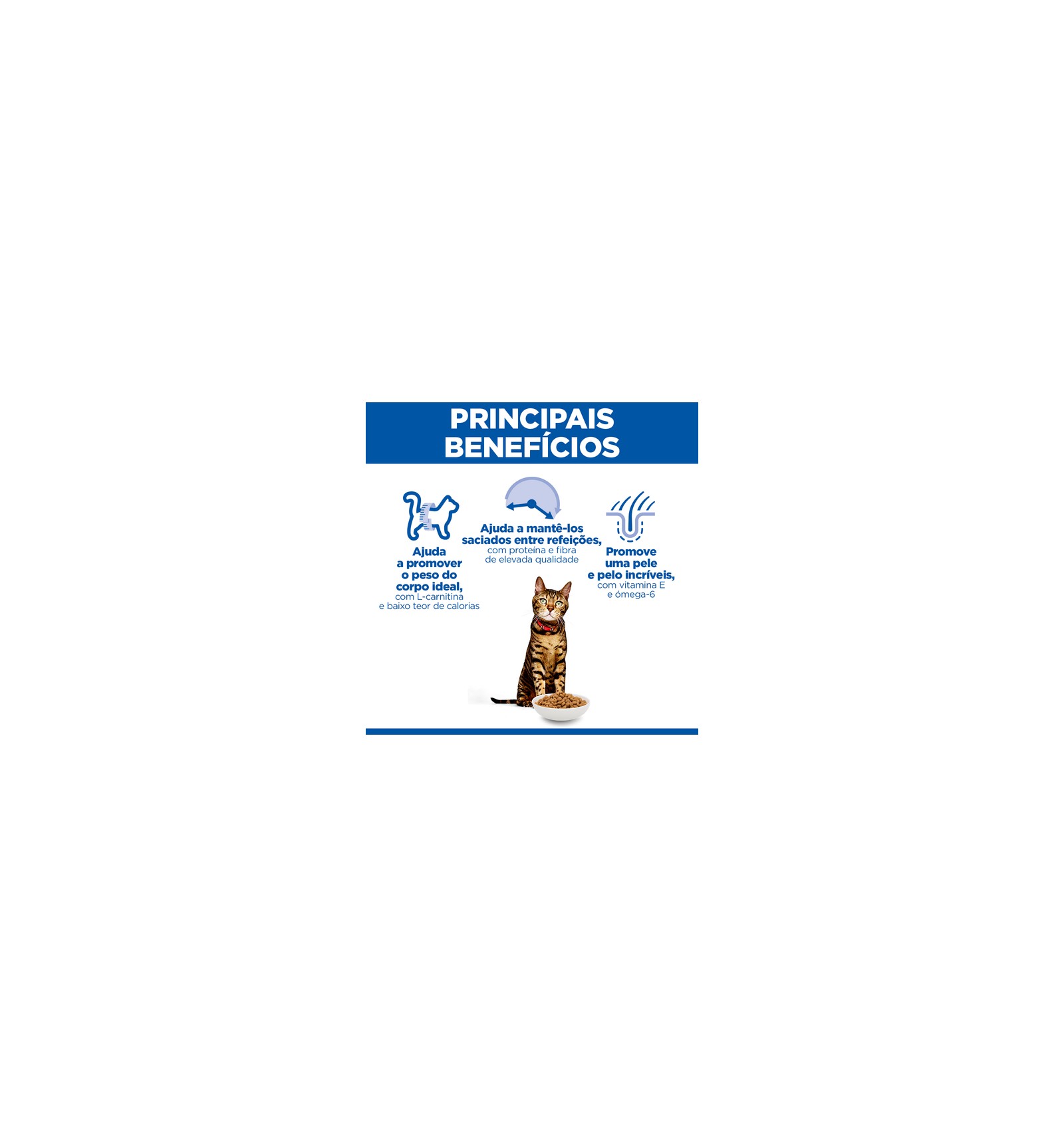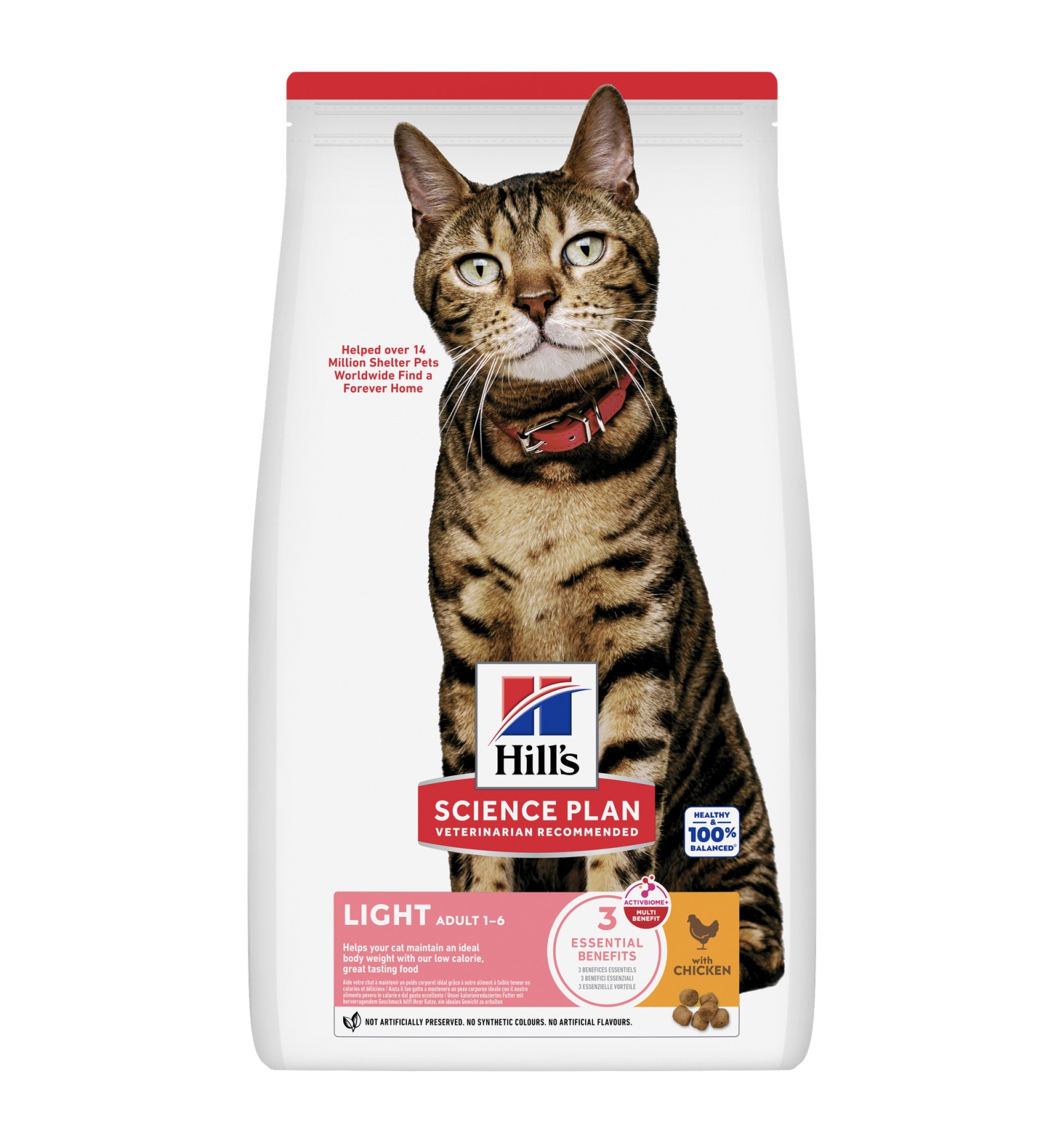 Hill's Science Plan Light alimento seco para gato adulto com frango proporciona uma nutrição 100% saudável e equilibrada. Contém a Tecnologia ActivBiome+ Multi-Benefit, uma combinação de fibras prebióticas e antioxidantes, para promover a saúde digestiva e o bem-estar geral do seu gato ao longo da sua vida. Nutrição baseada em ciência para promover vidas longas e saudáveis. Principais benefícios: