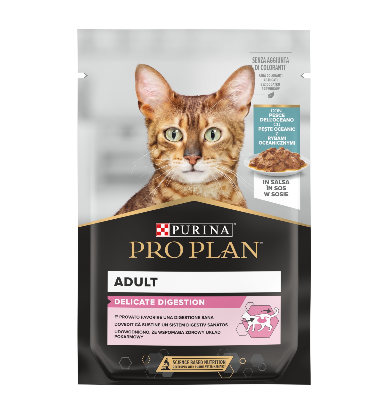 PURINA® PRO PLAN® Adulto DIGESTÃO DELICADA com peixe do oceano em molho comprovado que promove um sistema digestivo saudável e ajuda no maneio da pele sensível graças aos elevados níveis de ácidos gordos ómega 3 e 6.