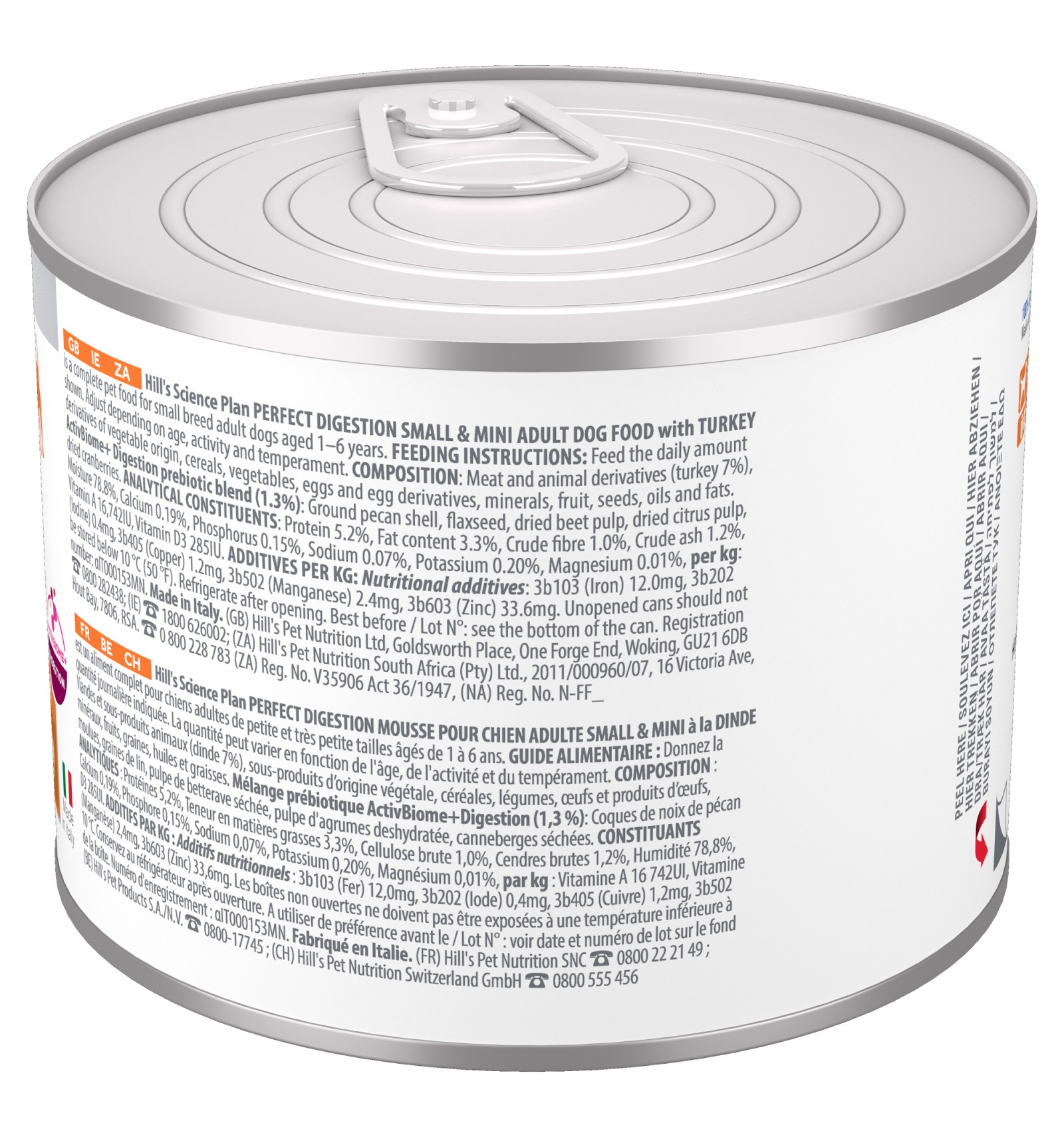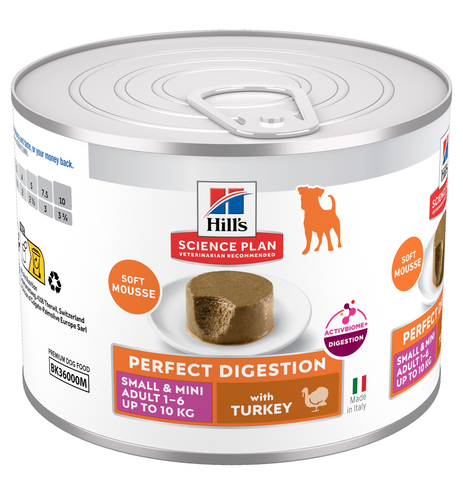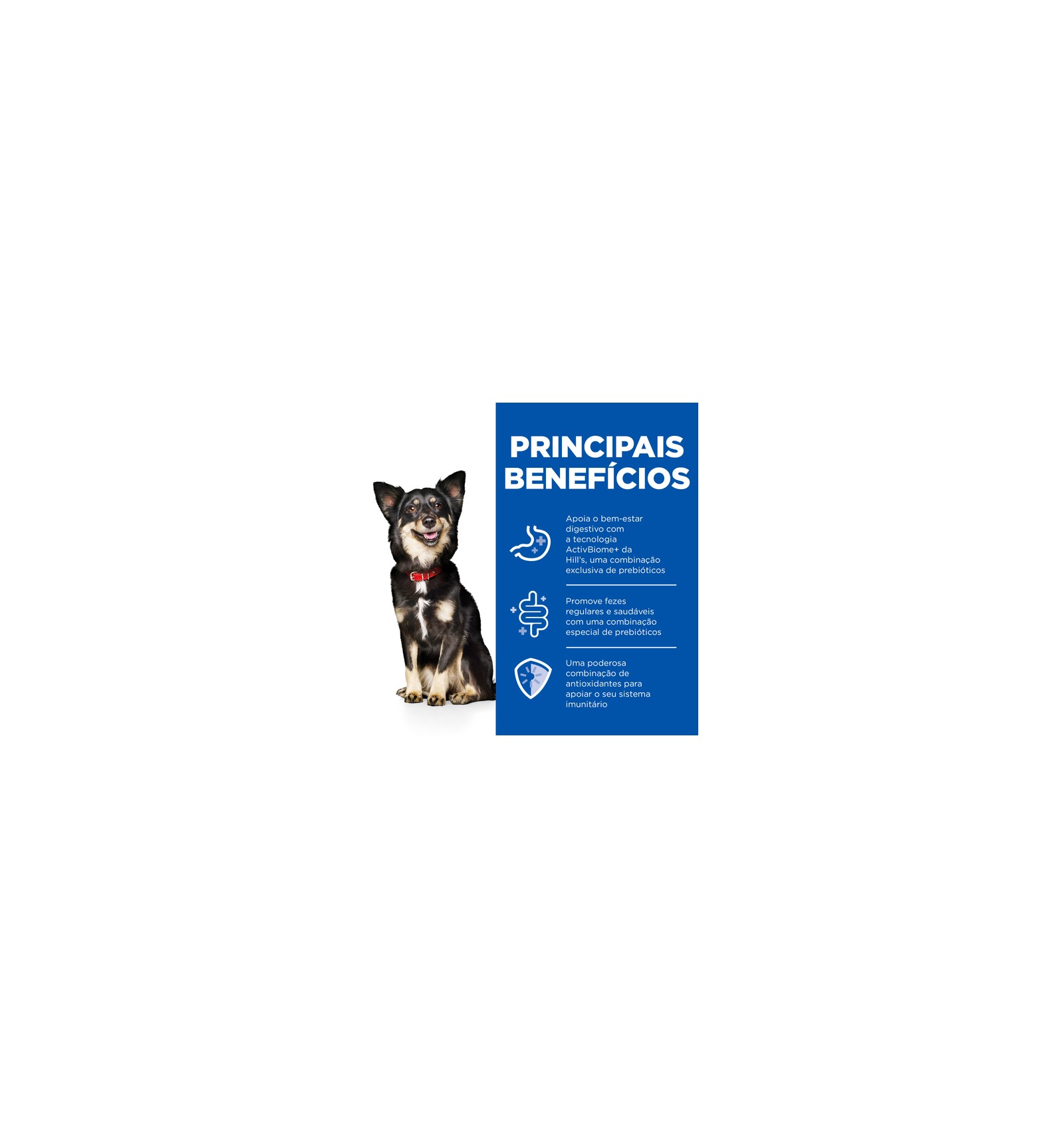 Uma vida longa e feliz, cheia de caudas a abanar — é isso que todos os cães merecem. Fornecemos-lhe uma nutrição saborosa para o ajudar a viver a vida ao máximo. Hill's Science Plan Perfect Digestion alimento para cão adulto de raça pequena e mini com peru contém ActivBiome+ Digestion, uma combinação exclusiva de prebióticos da Hill's para nutrir e equilibrar rapidamente o microbioma único do seu animal de companhia. Principais benefícios: