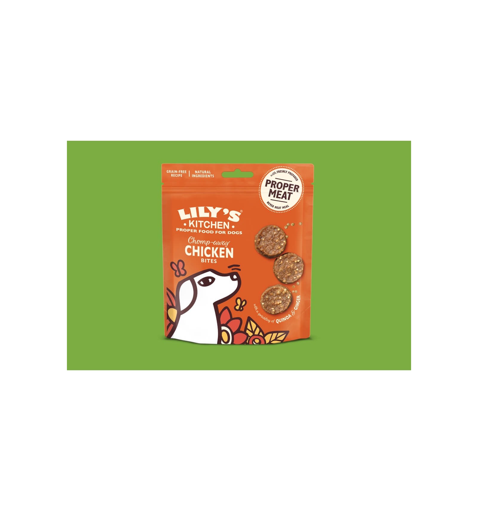 Estes snacks para cão são confecionadas segundo uma receita sem cereais, com frango acabado de preparar. Adicionámos uma pitada de quinoa (uma semente rica em proteínas) e um ligeiro toque de gengibre. Sem adição de açúcares, só com ingredientes naturais. Parece-lhe bem?