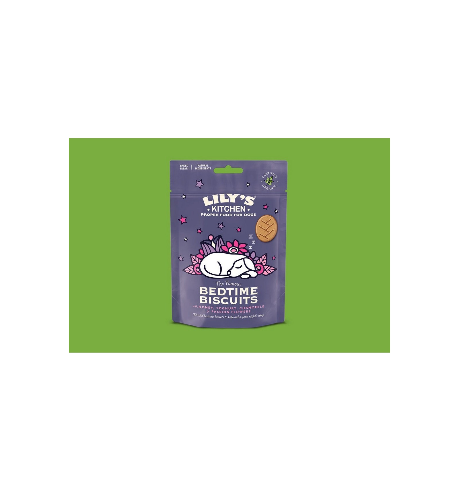 Deitar cedo e e cedo erguer traz saúde e faz crescer. Conheça os nossos deliciosos snacks de biscoitos de noite para cão. Desenvolvido com os nossos melhores ingredientes orgânicos e cozinhados no forno de forma tradicional para garantir a crocância ideal. Adicionámos ainda mel, bem como iogurte assim como camomila, conhecida pelas suas propriedades calmantes.