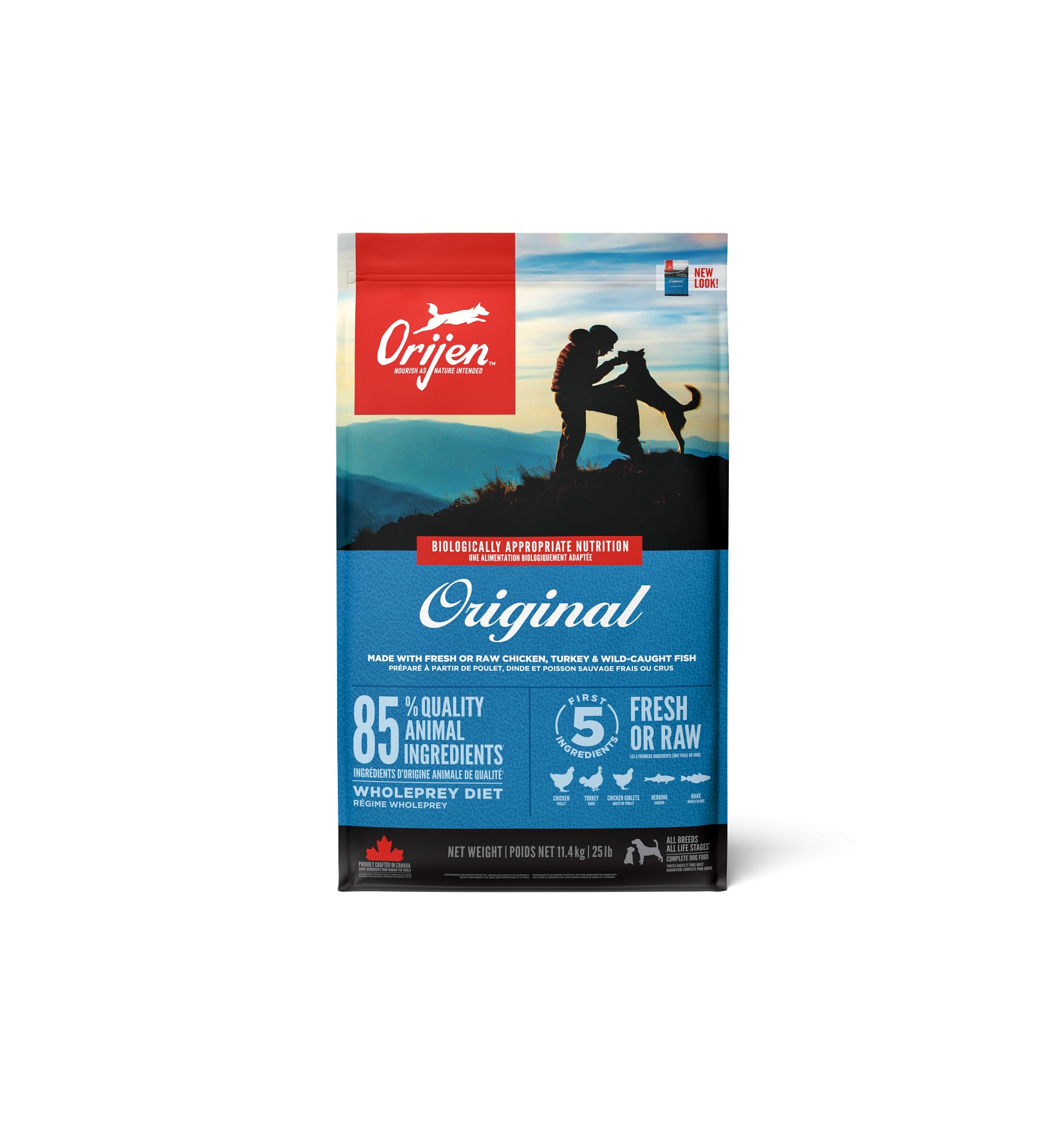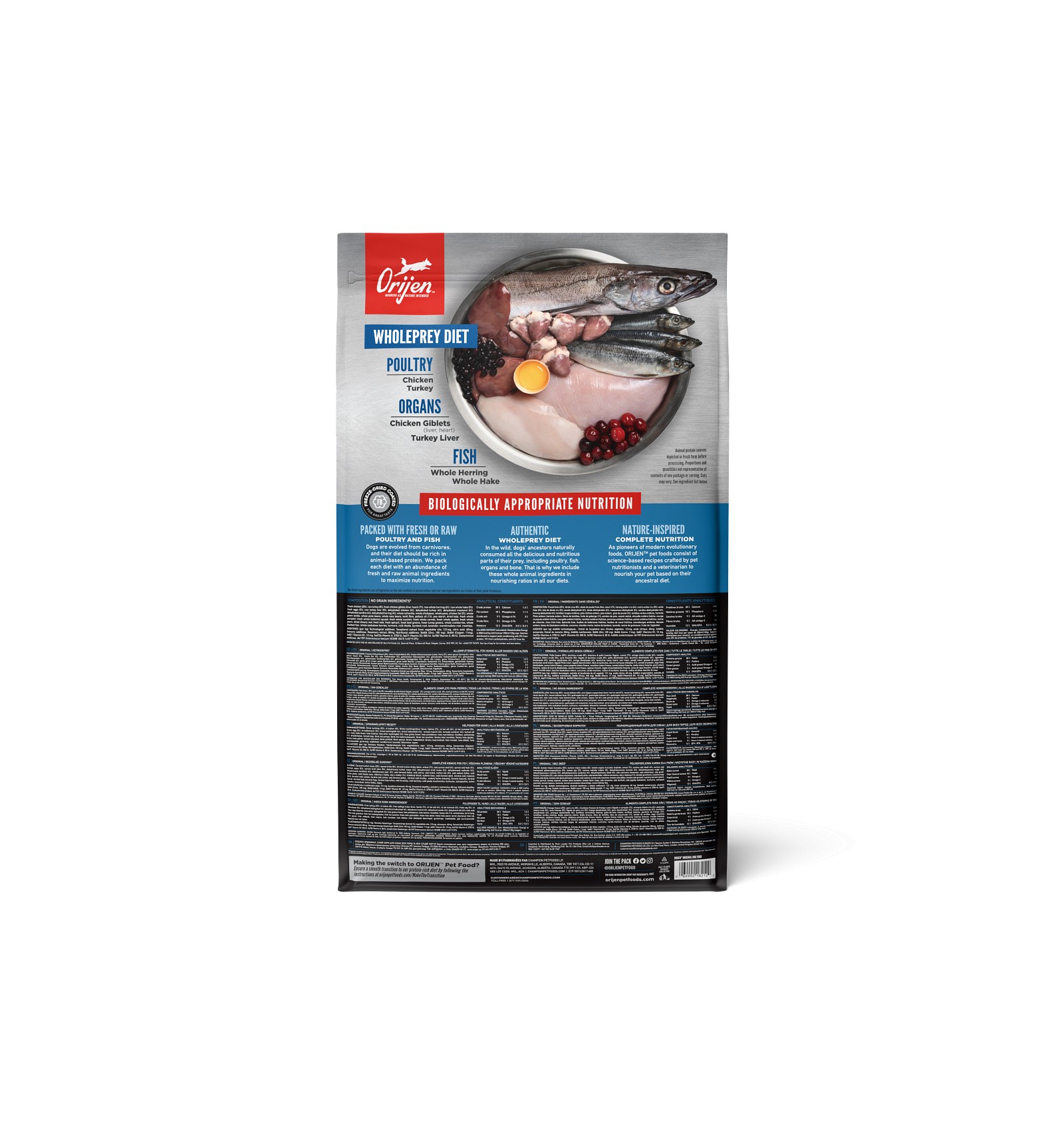 Tal como o seu antepassado lobo cinzento, todos os cães devem ter uma dieta rica e variada em ingredientes de origem animal. ORIJEN Original, um alimento completo para cães, é fabricado com carne, órgãos e ossos de frango e peru criados ao ar livre, peixe capturado na natureza e ovos frescos criados ao ar livre.