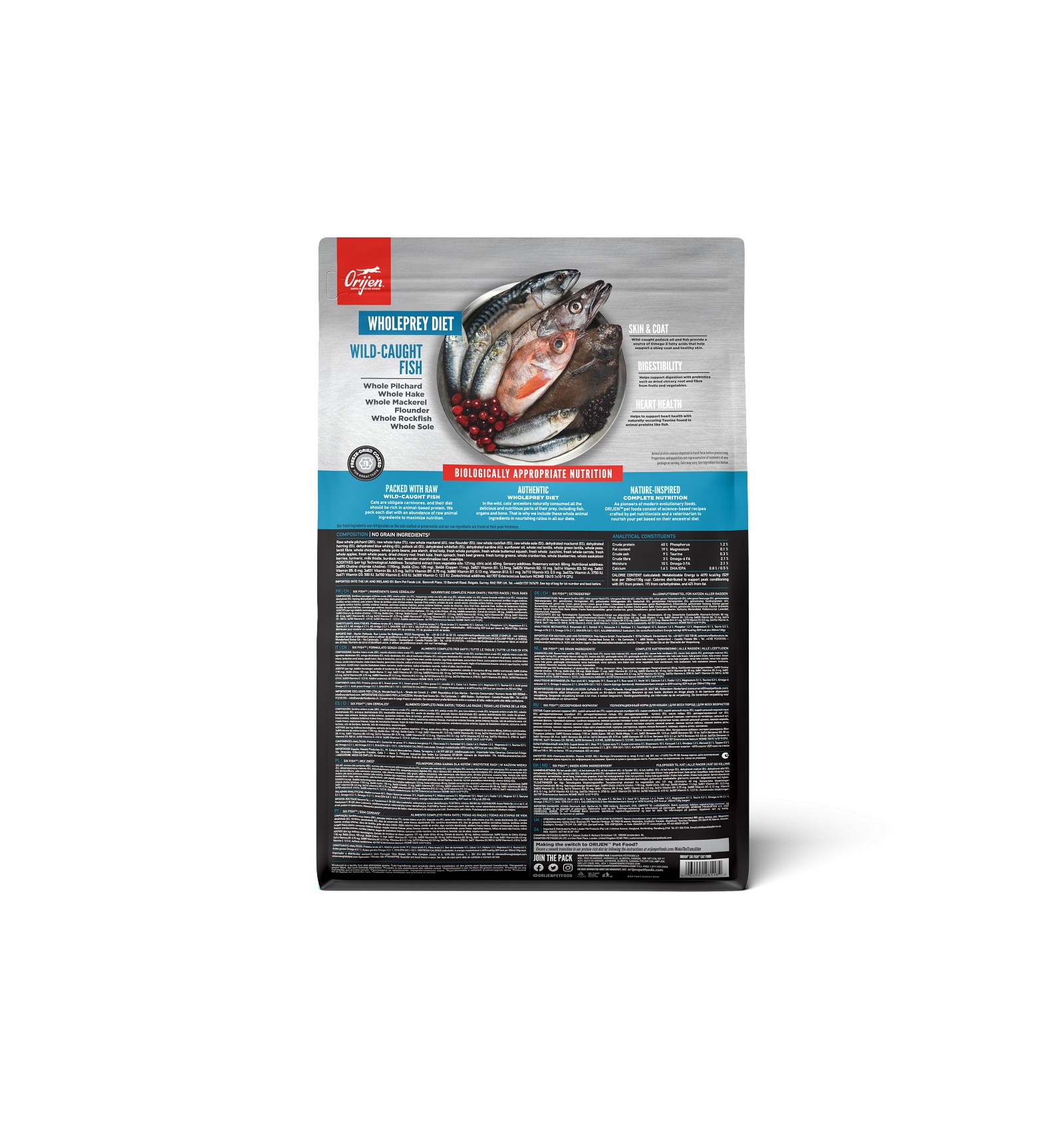 Sardinha do pacífco inteira fresca (26%), pescada do pacífco inteira fresca (9%), cavala do pacífco inteira fresca (8%), alabote-dente-curvo do pacífco inteiro fresco (5%), peixe-lobo inteiro fresco (5%), linguado inteiro fresco (5%), cavala inteira desidratada (5%), arenque inteiro desidratado (5%), verdinho inteiro desidratado (5%), óleo de arenque (5%), bacalhau do Alasca desidratado, (5%), lentilhas vermelhas inteiras, lentilhas verdes inteiras, ervilhas verdes com vagem, óleo de girassol extraído a frio, sardinhas inteiras (desidratada 1,5%), fibra de lentilha, grão-de-bico, ervilhas amarelas inteiras, feijão catarino inteiro, fígado de bacalhau liofilizado, abóbora fresca inteira, abóbora-almiscarada fresca inteira, curgete fresca inteira, pastinaca fresca inteira, cenouras frescas, maçãs Red Delicious inteiras frescas, peras Bartlett inteiras frescas, couve fresca, espinafres frescos, folhas de beterraba frescas, nabos frescos, alga laminária castanha, arandos inteiros, mirtilos inteiros, bagas de saskatoon inteiras, raiz de chicória, açafrão-das-índias, cardo-mariano, raiz de bardana, alfazema, raiz de alteia, roseira-silvestre. ADITIVOS (por kg): Aditivos tecnológicos: Extrato de tocoferóis de origem natural. Aditivos nutricionais: Zinco: 100 mg; Cobre: 11mg, Colina 1200mg. Aditivos zootécnicos: Enterococcus faecium NCIMB10415: 600x10^6 UFC.