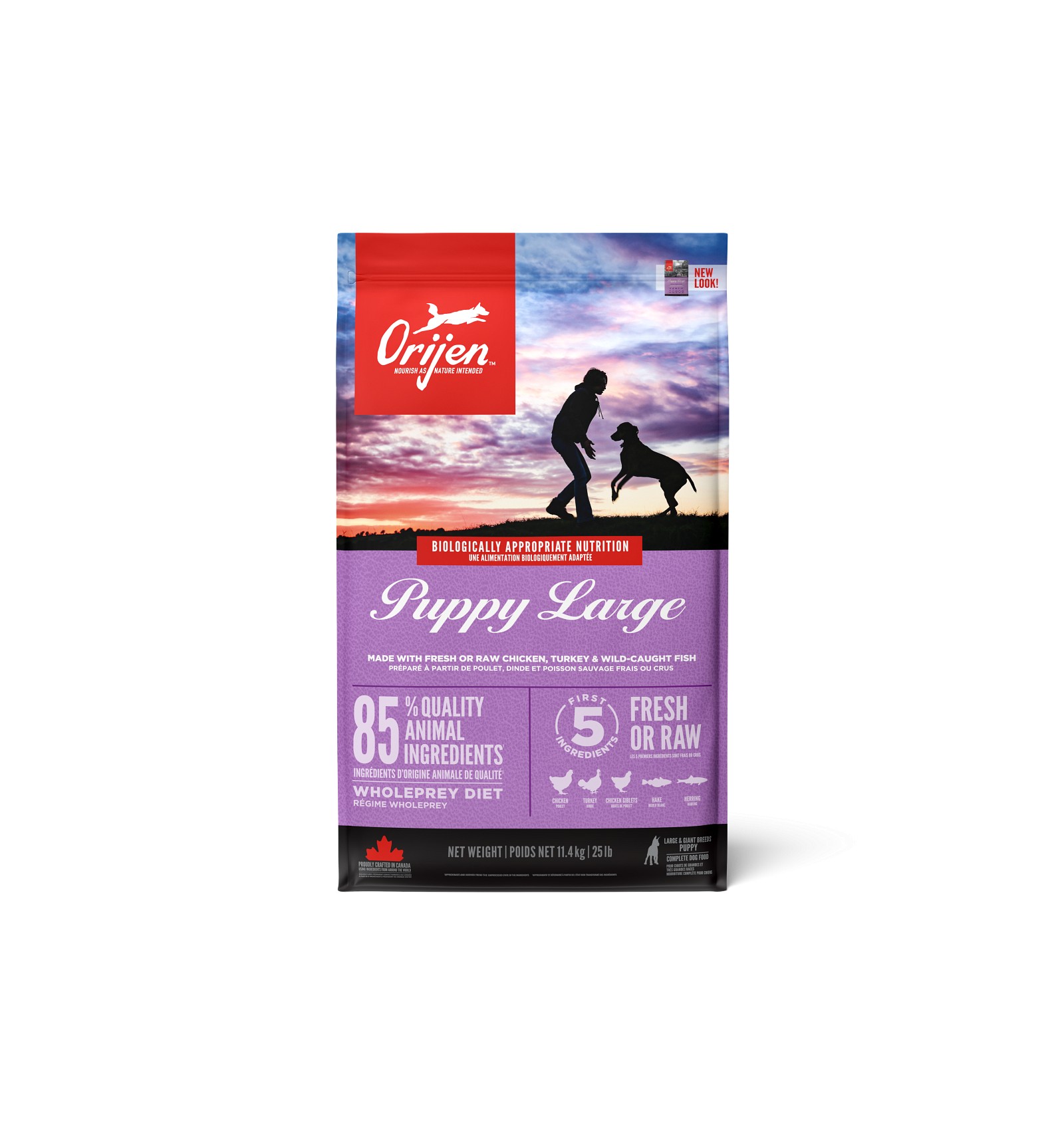 Ajude seu filhote de raça grande a prosperar com o poder de receitas ricas em proteínas que fornecem nutrição de pico. Os filhotes de raças grandes permanecem nutridos em uma dieta biologicamente apropriada, repleta de ingredientes de origem animal frescos ou crus para apoiar o desenvolvimento de pico, e esta dieta é adaptada às suas necessidades únicas. ORIJEN Puppy Large dieta é trabalhada com 85% de ingredientes de origem animal de qualidade, como frango e peru frescos ou crus de corrida livre, e peixes selvagens.