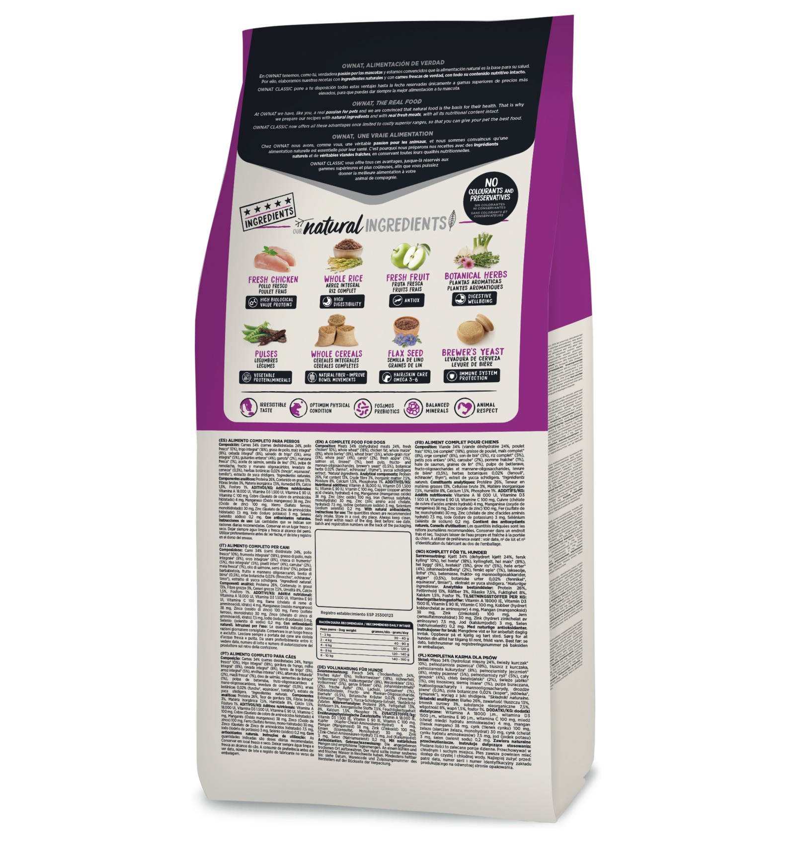 Carnes 34% (carnes desidratadas 24%, frango fresco* 10% antes da extrusão), trigo integral* (18%), gordura de frango, milho integral* (8%), cevada integral* (8%), farelo de trigo* (5%), arroz integral* (5%), ervilhas inteiras* (4%), alfarroba triturada* (2%), maçã* (1%), óleo de salmão, sementes de linhaça* (1%), polpa de beterraba, fruto-oligossacarídeos e mano-oligossacarídeos, levedura de cerveja* (0,5%), plantas aromáticas 0,02% (funcho*, equinácea*, tomilho*), yucca schidigera. *Ingredientes naturais