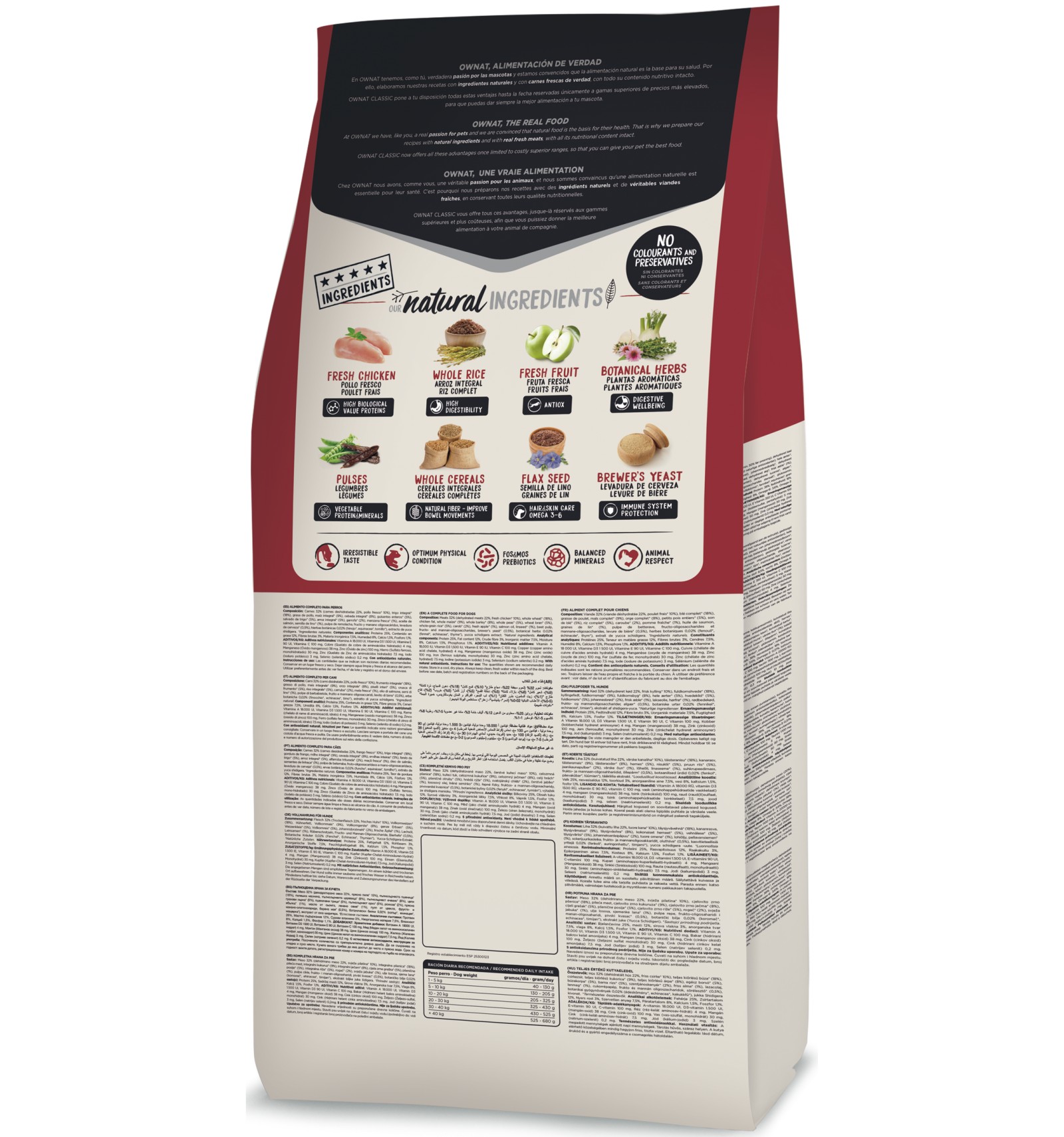 Carnes 32% (carnes desidratadas 22%, frango fresco* 10% antes da extrusão), trigo integral* (18%), gordura de frango, milho integral* (9%), cevada integral* (8%), ervilhas inteiras* (5%), farelo de trigo* (5%), arroz integral* (5%), alfarroba triturada* (2%), maçã* (1%), óleo de salmão, sementes de linhaça* (1%), polpa de beterraba, fruto-oligossacarídeos e mano-oligossacarídeos, levedura de cerveja* (0,5%), plantas aromáticas 0,02% (funcho*, equinácea*, tomilho*), yucca schidigera. *INGREDIENTES NATURAIS