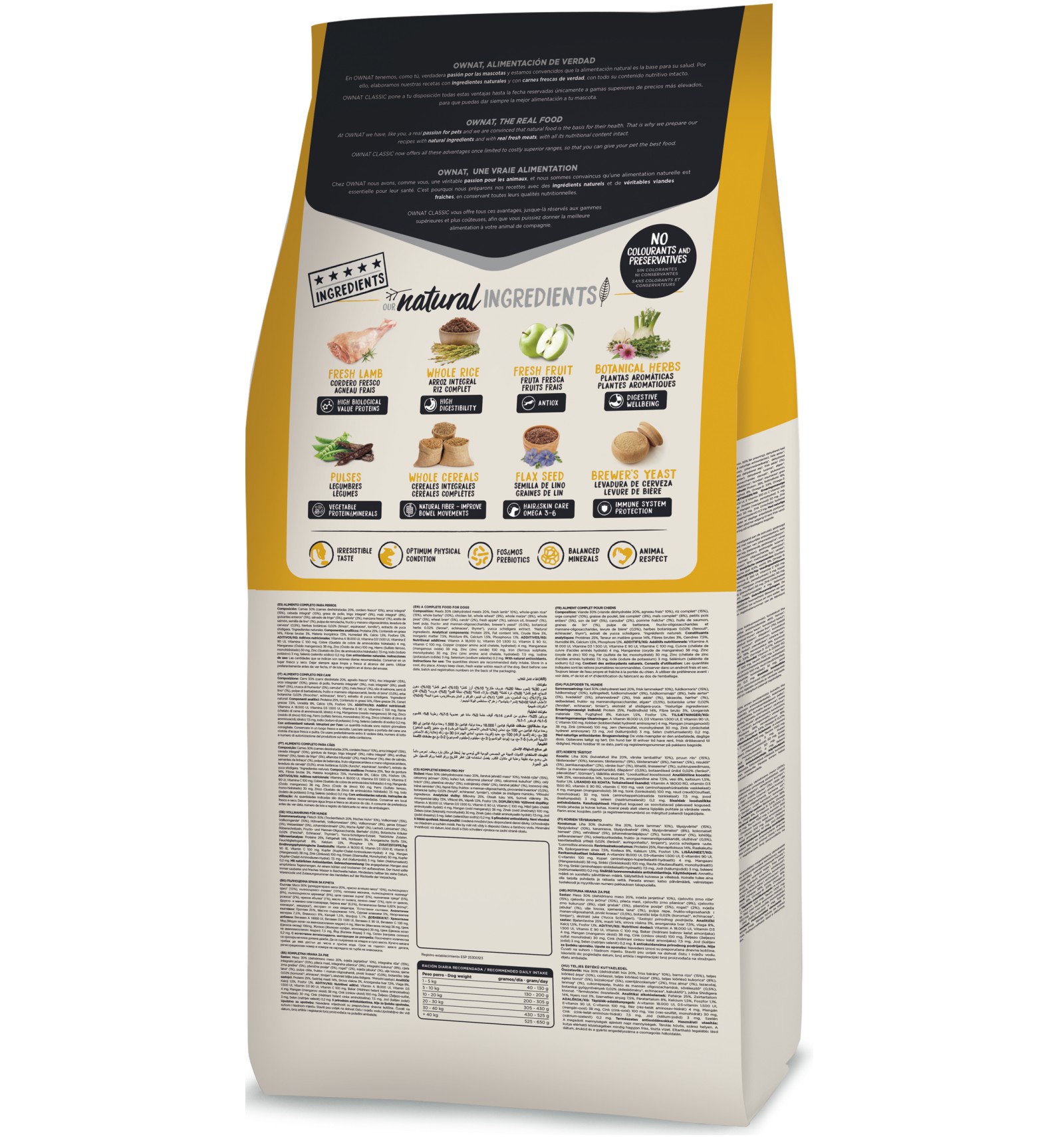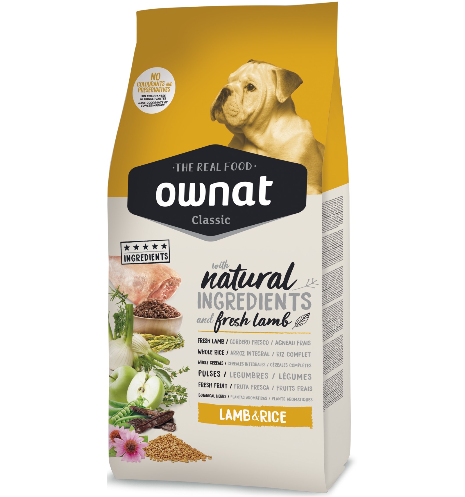 Carnes 30% (carnes desidratadas 20%, cordeiro fresco* 10% antes da extrusão), arroz integral* (15%), cevada integral* (10%), gordura de frango, trigo integral* (9%), milho integral* (8%), ervilhas inteiras* (5%), farelo de trigo* (5%), alfarroba triturada* (2%), maçã* (1%), óleo de salmão, sementes de linhaça* (1%), polpa de beterraba, fruto-oligossacarídeos e mano-oligossacarídeos, levedura de cerveja* (0,5%), plantas aromáticas 0,02% (funcho*, equinácea*, tomilho*), yucca schidigera. *INGREDIENTES NATURAIS