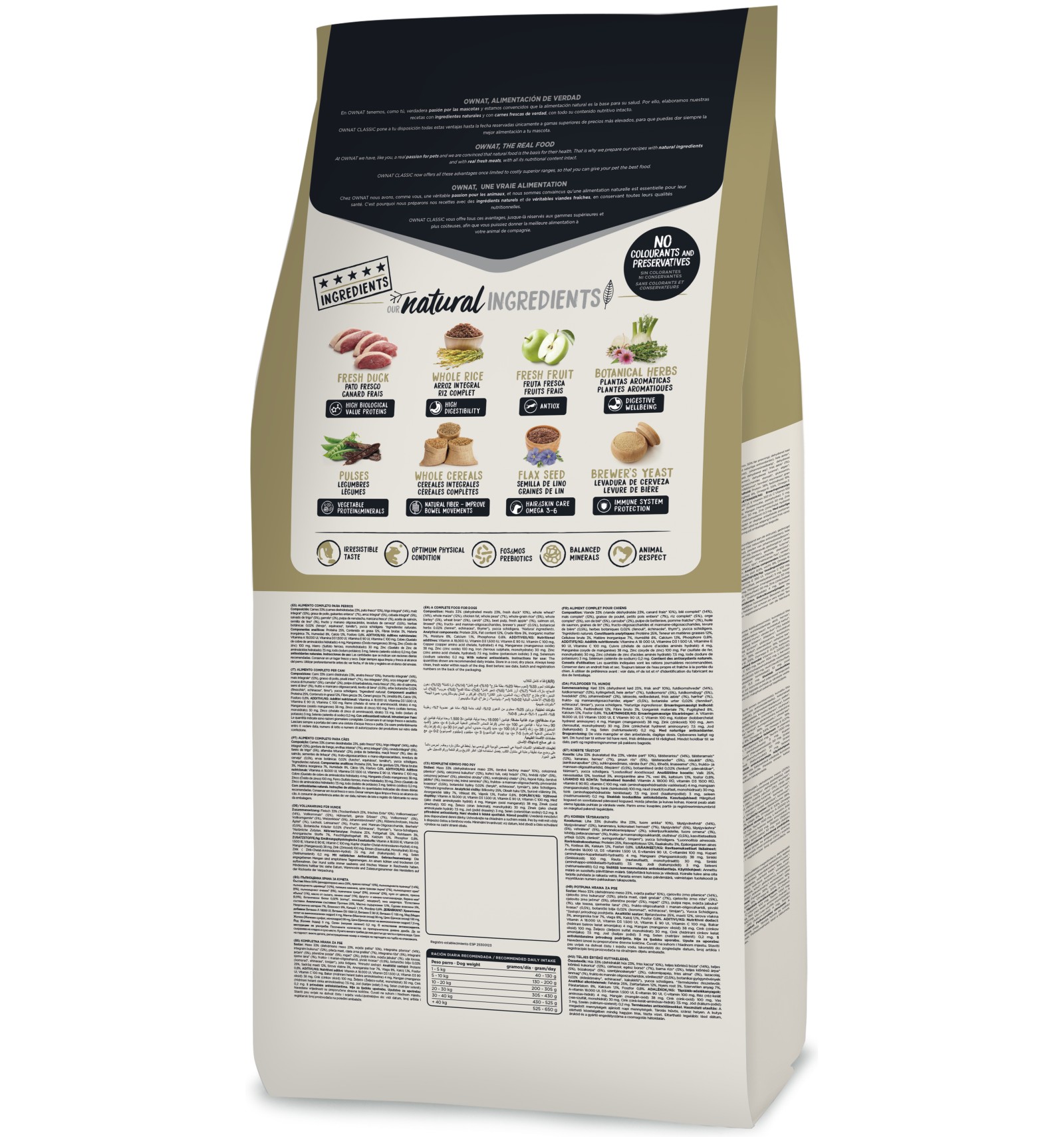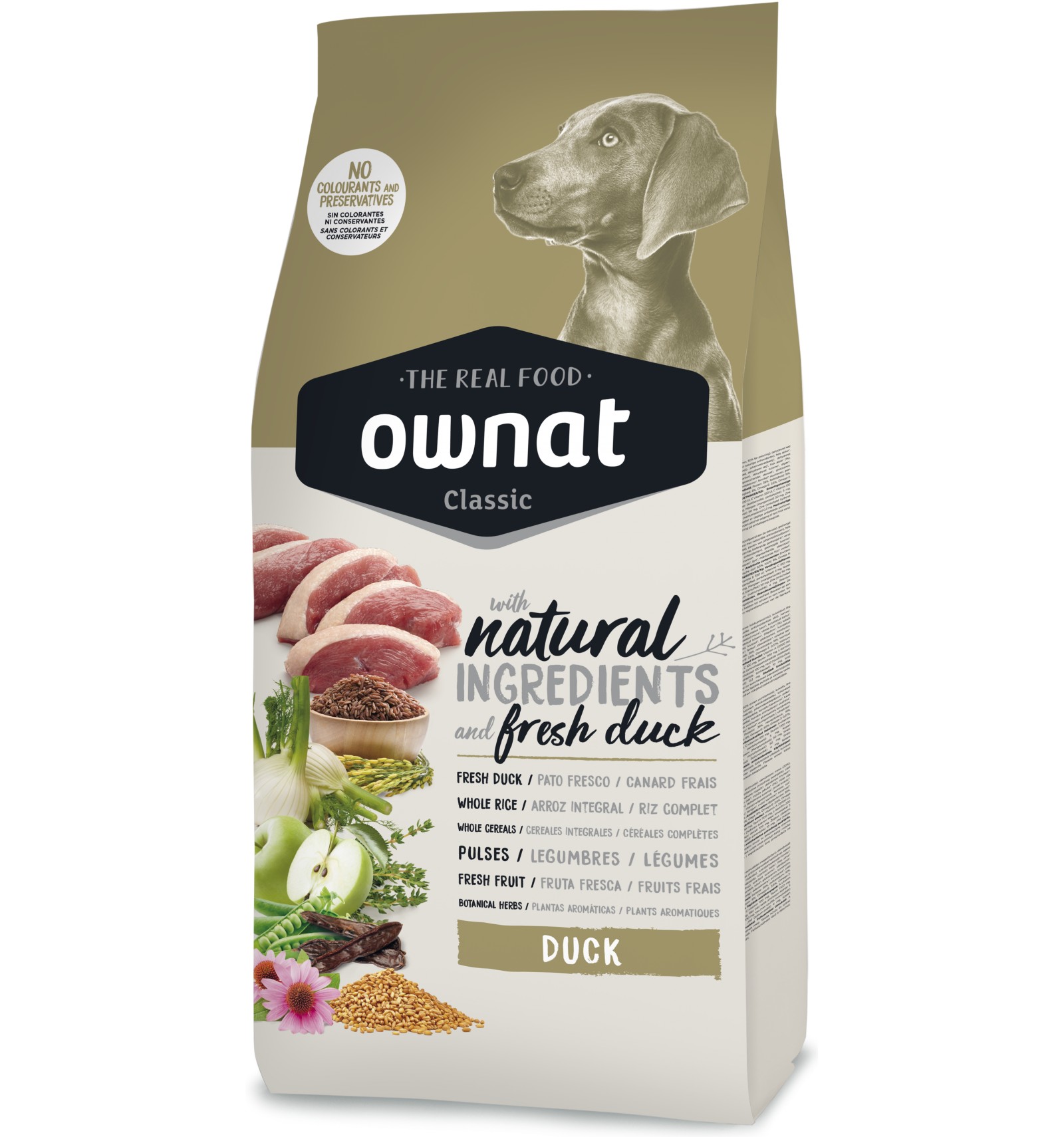Carnes 33% (carnes desidratadas 23%, pato fresco* 10% antes da extrusão), trigo integral* (14%), milho integral* (12%), gordura de frango, ervilhas inteiras* (7%), arroz integral* (5%), cevada integral* (5%), farelo de trigo* (5%), alfarroba triturada* (2%), polpa de beterraba, maçã* (1%), óleo de salmão, sementes de linhaça* (1%), fruto-oligossacarídeos e mano-oligossacarídeos, levedura de cerveja* (0,5%), plantas aromáticas 0,02% (funcho*, equinácea*, tomilho*), yucca schidigera. *INGREDIENTES NATURAIS