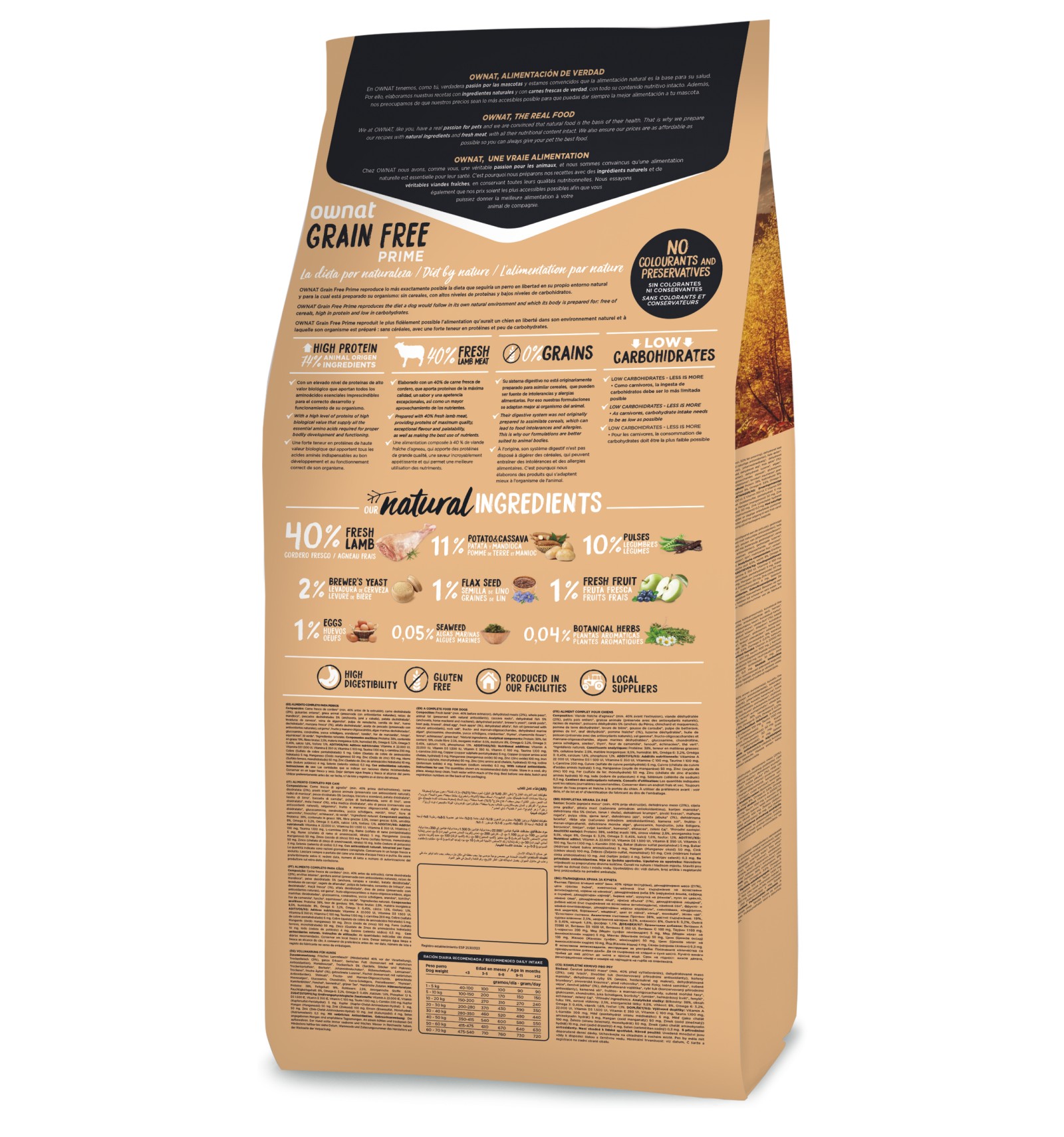 Cordeiro fresco* (mín. 40% antes da extrusão), porco desidratado (15%), ervilhas inteiras* (8%), gordura animal (preservada com antioxidantes naturais), cordeiro desidratado (6%), raízes de mandioca* (6%), peixe desidratado 5% (anchova, carapau e cavala), batata desidratada* (5%), leveduras de cerveja* (2%), vagem de alfarroba* (2%), polpa de beterraba, sementes de linhaça* (1%), ovo desidratado* (1%), maçã* (1%), alfafa desidratada*, óleo de peixe (preservado com antioxidantes naturais), sal-gema*, fruto-oligossacarídeos e mano-oligossacarídeos, algas marinhas desidratadas* (500 mg/kg), glucosamina (500 mg/kg), yucca schidigera, sulfato de condroitina (100 mg/kg), arandos* (100 mg/kg), tomilho* (80 mg/kg), flor de camomila* (80 mg/kg), funcho* (80 mg/kg), equinácea* (80 mg/kg), chá verde* (80 mg/kg). *INGREDIENTES NATURAIS