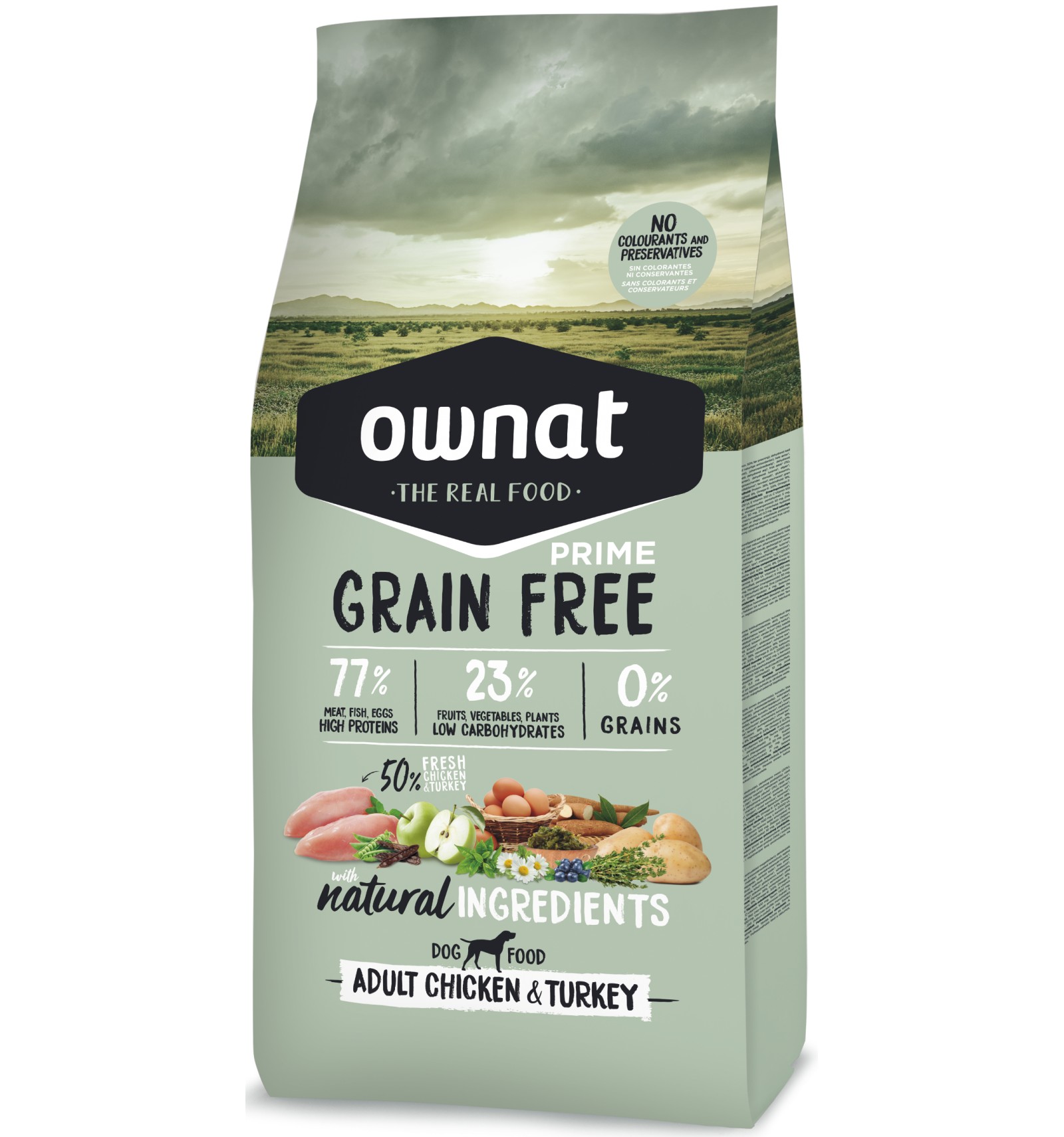 Frango fresco* (mín. 25% antes da extrusão), peru fresco* (mín. 25% antes da extrusão), frango desidratado (14%), raízes de mandioca* (6%), porco desidratado (6%), ervilhas inteiras* (5%), gordura avícola (preservada com antioxidantes naturais), peixe desidratado (anchova, carapau e cavala), vagem de alfarroba* (3%), batata desidratada* (3%), proteína hidrolisada de frango, polpa de beterraba, ovo desidratado* (1%), maçã* (1%), óleo de peixe (preservado com antioxidantes naturais), alfafa desidratada*, levedura de cerveja* (1%), algas marinhas desidratadas* (500 mg/kg), fruto-oligossacarídeos e mano-oligossacarídeos, sal-gema*, glucosamina (500 mg/kg), yucca schidigera, sulfato de condroitina (100 mg/kg), arandos* (100 mg/kg), tomilho* (80 mg/kg), flor de camomila* (80 mg/kg), funcho* (80 mg/kg), equinácea* (80 mg/kg), chá verde* (80 mg/kg). *INGREDIENTES NATURAIS