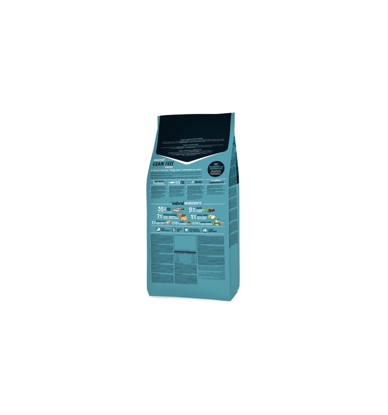 Peixe azul fresco* (mín. 35% antes da extrusão), frango desidratado (20%), hidrolisado de salmão (9%), gordura avícola (preservada com antioxidantes naturais), ervilhas inteiras* (7%), raízes de mandioca* (5%), salmão desidratado (4%), vagem de alfarroba* (2%), batata desidratada* (2%), proteína hidrolisada de frango, levedura de cerveja* (1%), maçã* (1%), polpa de beterraba, óleo de peixe (preservado com antioxidantes naturais), sal-gema*, alfafa desidratada*, fruto-oligossacarídeos e mano-oligossacarídeos, algas marinhas desidratadas* (500 mg/kg), glucosamina (500 mg/kg), yucca schidigera, sulfato de condroitina (100 mg/kg), arandos* (100 mg/kg), tomilho* (80 mg/kg), flor de camomila* (80 mg/kg), funcho* (80 mg/kg), equinácea* (80 mg/kg), chá verde* (80 mg/kg).