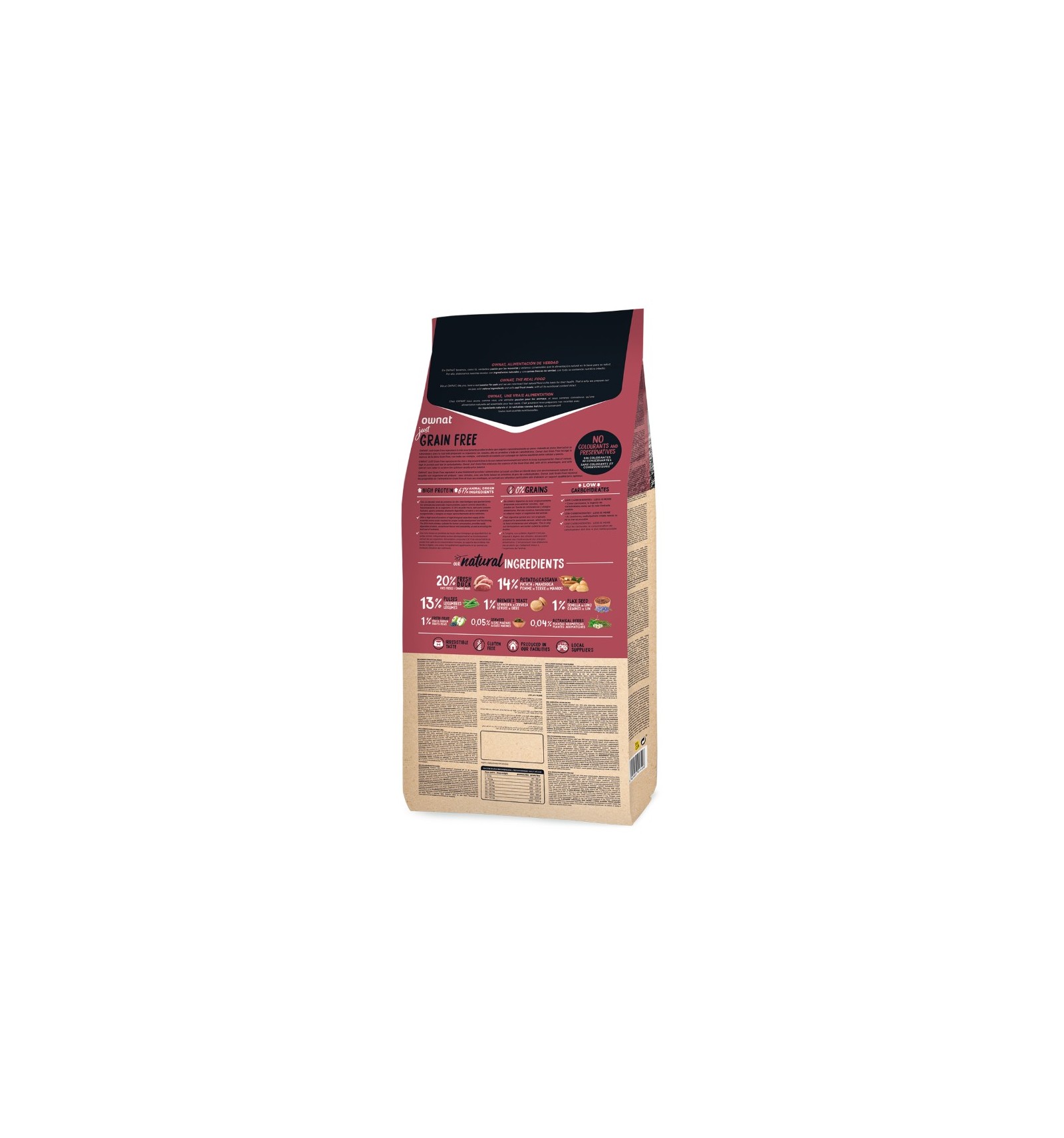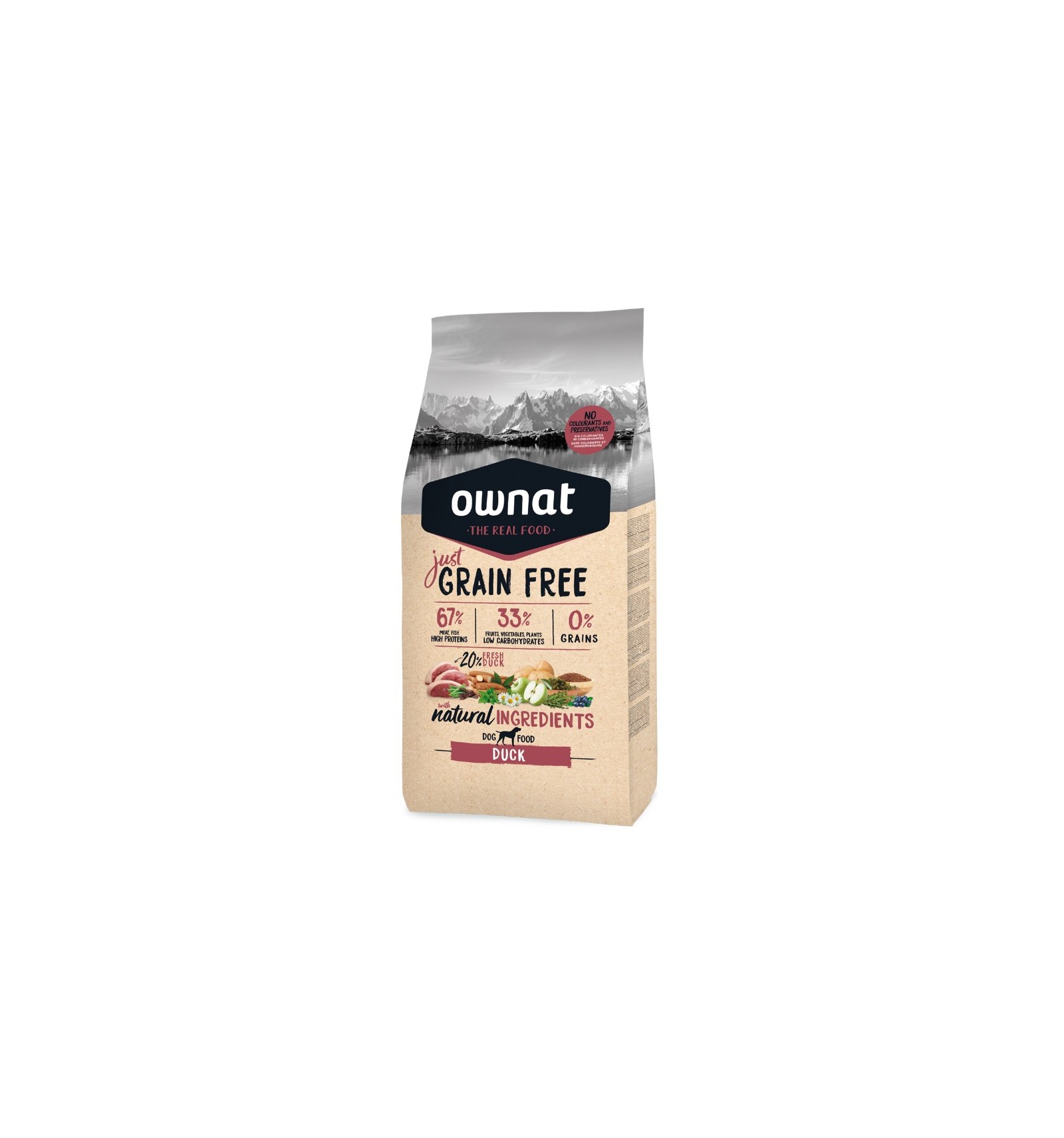 Pato 30% (pato fresco* mín. 20% antes da extrusão, pato desidratado 10%), frango desidratado (26%), batata desidratada* (9%), ervilhas inteiras* (8%), gordura avícola (preservada com antioxidantes naturais), raízes de mandioca* (5%), vagem de alfarroba* (5%), proteína hidrolisada de frango, levedura de cerveja* (1%), polpa de beterraba, maçã* (1%), óleo de peixe (preservado com antioxidantes naturais), sementes de linhaça* (1%), sal-gema*, alfafa desidratada*, fruto-oligossacarídeos e mano-oligossacarídeos, algas marinhas desidratadas* (500 mg/kg), glucosamina (500 mg/kg), yucca schidigera, sulfato de condroitina (100 mg/kg), arandos* (100 mg/kg), tomilho* (80 mg/kg), flor de camomila* (80 mg/kg), funcho* (80 mg/kg), equinácea* (80 mg/kg), chá verde* (80 mg/kg). *INGREDIENTES NATURAIS