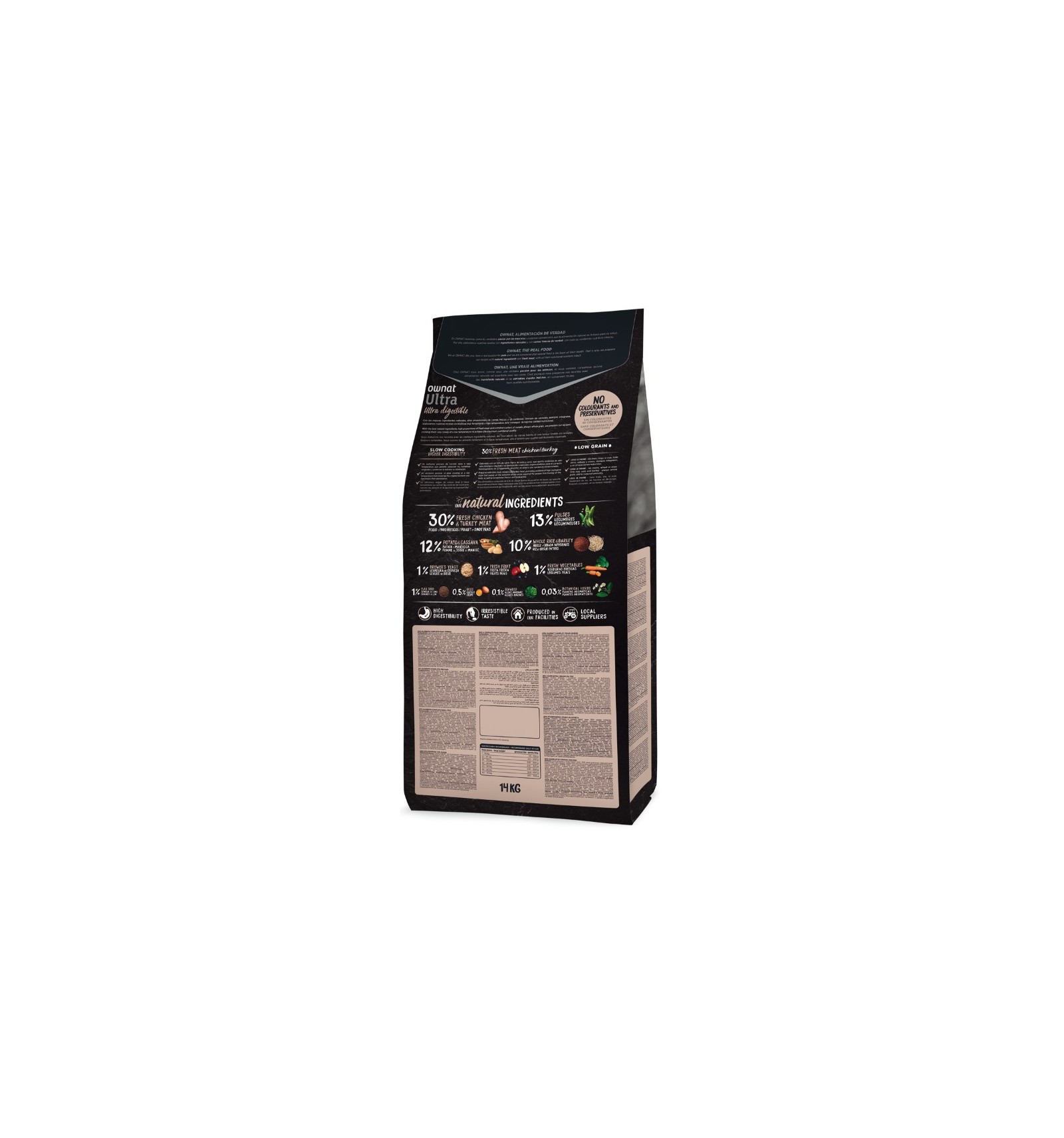 Frango desidratado (17%), frango fresco* (15% mín. antes de cozinhar), peru fresco* (15% mín. antes de cozinhar), ervilhas inteiras* (9%), gordura de frango (preservada com antioxidantes naturais), raízes de mandioca* (8%), arroz integral* (7%), vagem de alfarroba* (4%), batata desidratada* (4%), cevada integral* (3%), salmão desidratado (2%), proteína hidrolisada de frango (2%), legumes e frutas frescas antes de cozinhar (maçã* 1%, cenoura* 0,5%, brócolos* 0,5%), polpa de beterraba, levedura de cerveja* (1%), sementes de linhaça* (1%), óleo de salmão (preservado com antioxidantes naturais), ovo desidratado* (0,5%), sal-gema*, alfafa desidratada*, raízes de chicória (FOS)*, extrato de levedura (MOS), algas marinhas desidratadas* (500 mg/kg), glucosamina (500 mg/kg), yucca schidigera, sulfato de condroitina (100 mg/kg), arandos* (100 mg/kg), chá verde* (100 mg/kg), equinácea* (100 mg/kg), flor de camomila* (100 mg/kg). *INGREDIENTES NATURAIS