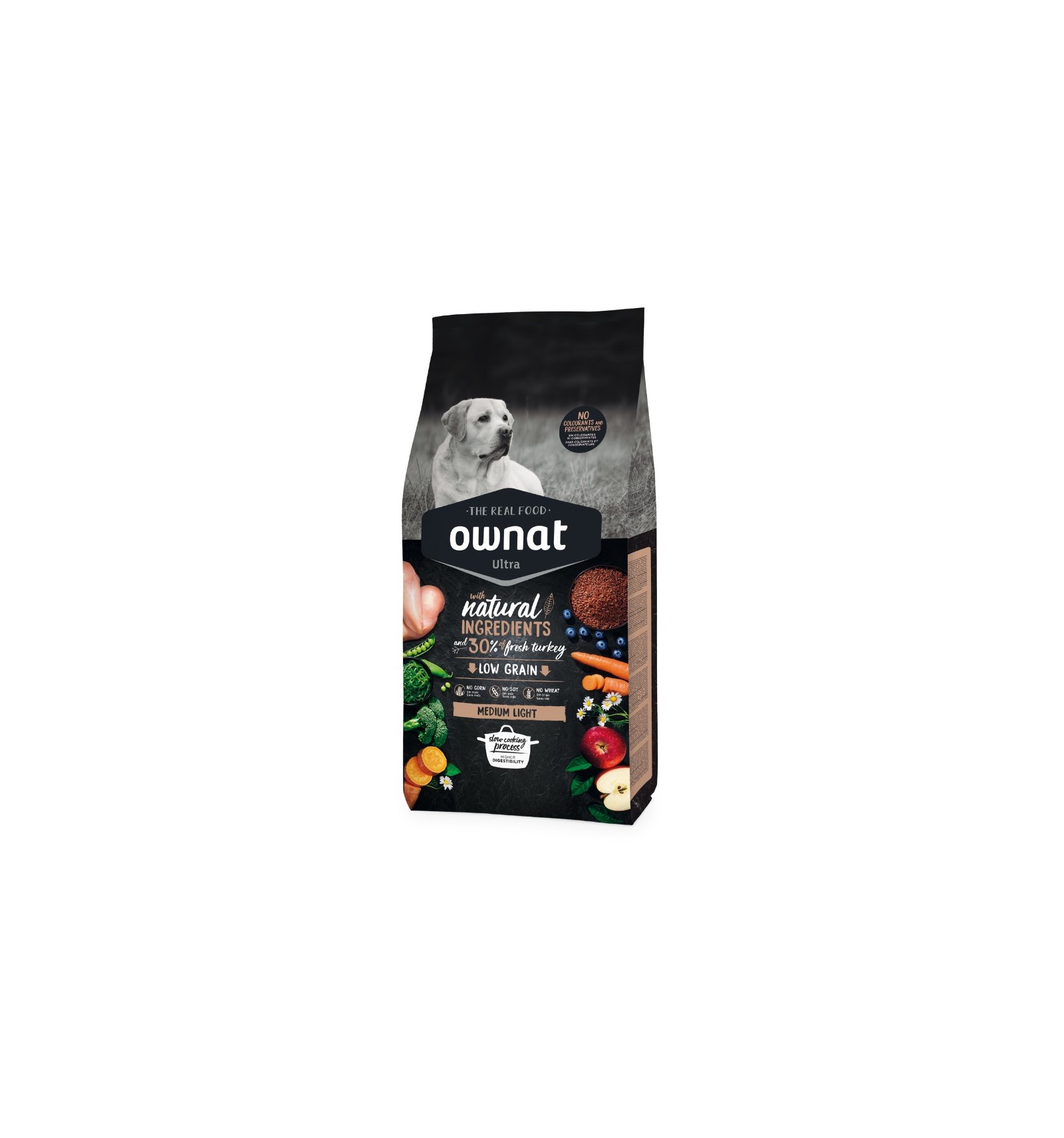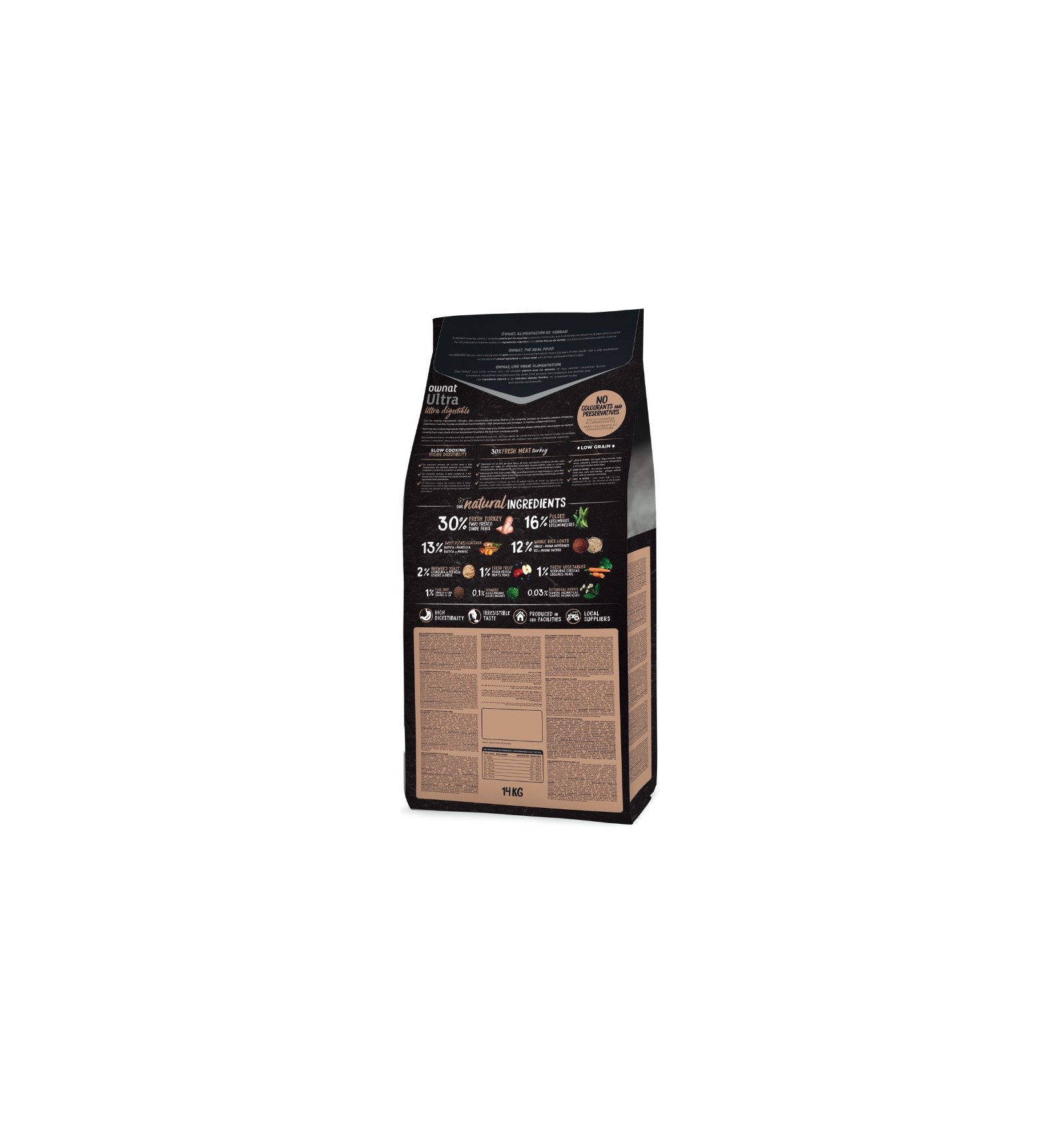 Peru fresco* (30 % min. antes de cozinhar), frango desidratado (17 %), batata doce desidratada* (10 %), arroz integral* (9 %), raízes de mandioca* (9 %), ervilhas inteiras* (4 %), aveia integral* (4 %), porco desidratado (3 %), vagem de alfarroba* (3 %), polpa de beterraba, gordura avícola (preservada com antioxidantes naturais), legumes e frutas frescas antes da cozinhar (maçã* 1 %, cenoura* 0,5 %, brócolos* 0,5 %), proteína hidrolisada de frango, levedura de cerveja* (1 %), óleo de salmão (preservado com antioxidantes naturais), sal-gema*, alfalfa desidratada*, raízes de chicória (FOS)*, produtos de leveduras (MOS), algas marinhas desidratadas* (500 mg/kg), glucosamina (500 mg/kg), yucca shidigera, sulfato de condroitina (100 mg/kg), arandos* (100 mg/kg), chá verde* (80 mg/kg), equinácea* (80 mg/kg), flor de camomila* (80 mg/kg), funcho* (80 mg/kg). *INGREDIENTES NATURAIS