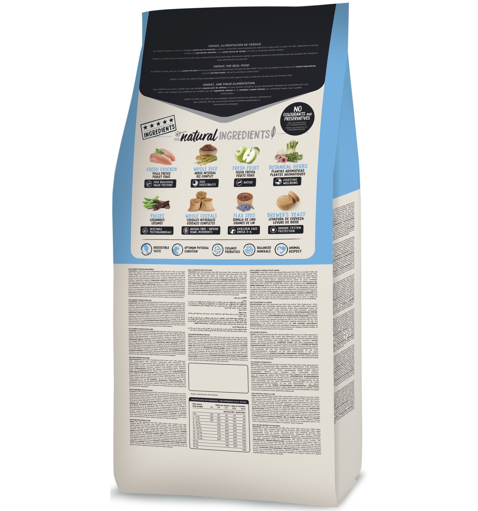 Carnes 39% (carnes desidratadas 29%, frango fresco* 10% antes da extrusão), arroz integral* (12%), trigo integral* (9%), gordura de frango, milho integral* (8%), farelo de trigo* (8%), cevada integral* (7%), ervilhas inteiras* (2%), maçã* (1%), óleo de salmão, sementes de linhaça* (1%), polpa de beterraba, fruto-oligossacarídeos e mano-oligossacarídeos, levedura de cerveja* (0,5%), plantas aromáticas 0,02% (funcho*, equinácea*, tomilho*), yucca schidigera. *INGREDIENTES NATURAIS