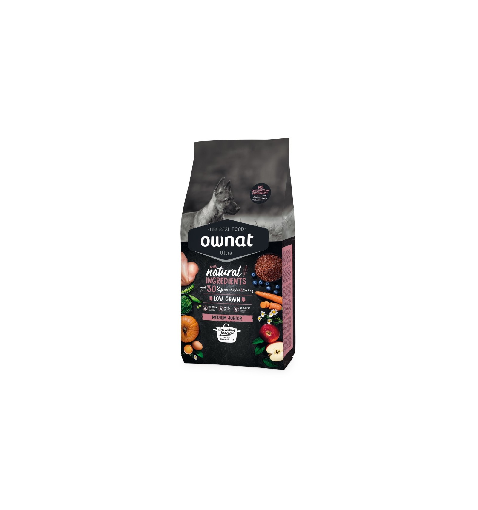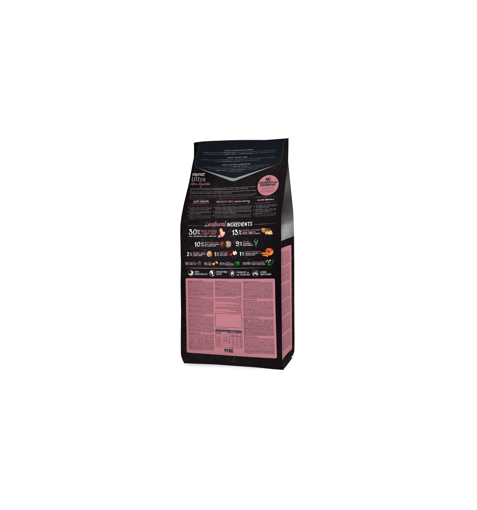 Frango desidratado (18%), frango fresco* (15% mín. antes de cozinhar), peru fresco* (15% mín. antes de cozinhar), ervilhas inteiras* (9%), gordura de frango (preservada com antioxidantes naturais), batata desidratada* (8%), arroz integral* (7%), raízes de mandioca* (5%), cevada integral* (3%), salmão desidratado (2,5%), levedura de cerveja* (2%), proteína hidrolisada de frango (2%), ovo desidratado* (1%), sementes de linhaça* (1%), óleo de salmão (preservado com antioxidantes naturais), polpa de beterraba, legumes e frutas frescas antes de cozinhar (maçã* 1%, cenoura* 0,5%, abóbora* 0,5%), sal-gema*, raízes de chicória (FOS)*, extrato de leveduras (MOS), algas marinhas desidratadas* (500 mg/kg), glucosamina (500 mg/kg), yucca schidigera, sulfato de condroitina (100 mg/kg), arandos* (100 mg/kg), chá verde* (80 mg/kg), equinácea* (80 mg/kg), flor de camomila* (80 mg/kg), funcho* (80 mg/kg). *INGREDIENTES NATURAIS