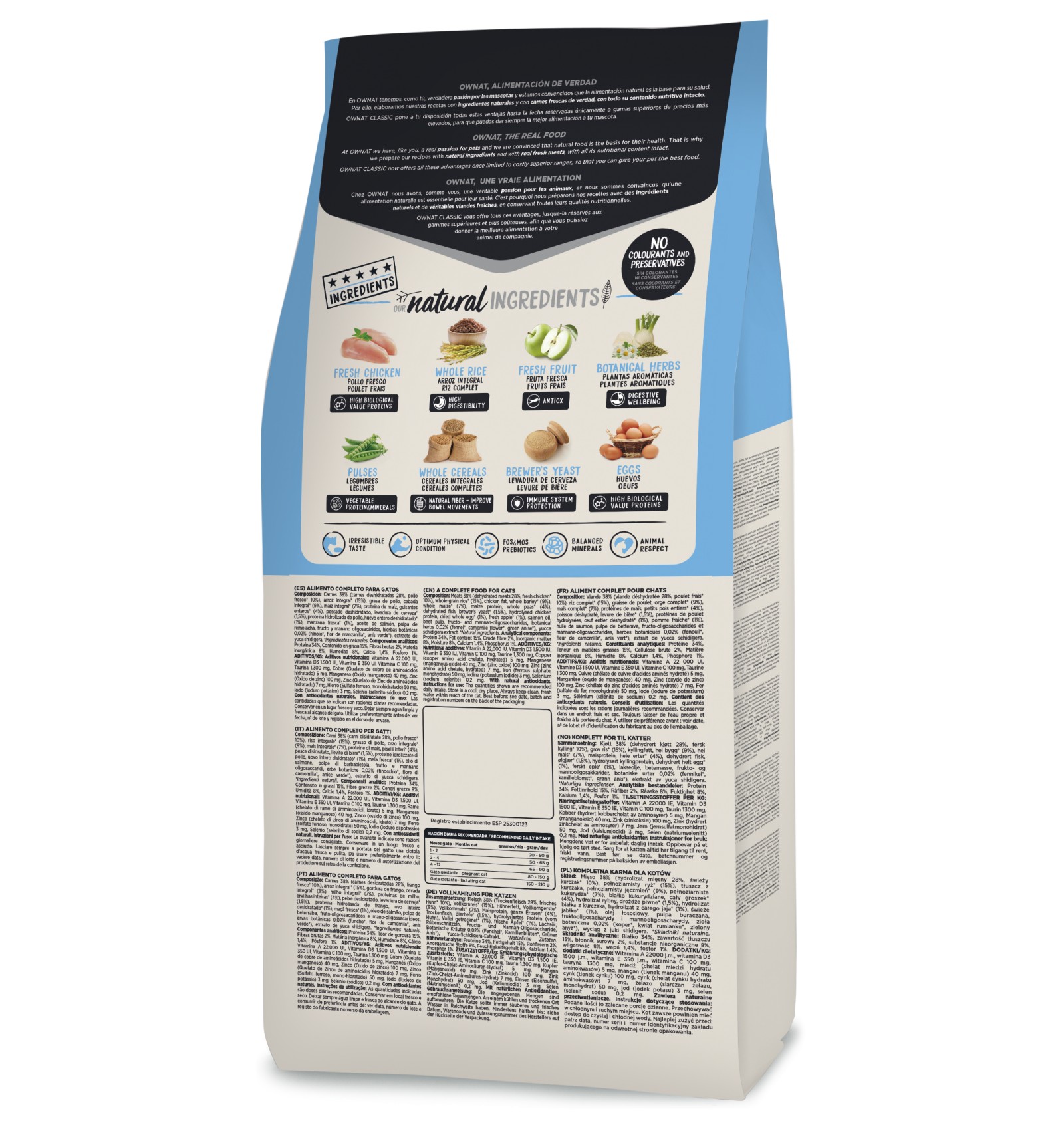 Vitamina A 22.000 UI, vitamina D3 1.500 UI, vitamina E 350 UI, vitamina C 100 mg, taurina 1.300 mg, cobre (quelato de cobre (II) de aminoácidos hidratado) 5 mg, manganês (óxido de manganês (II)) 40 mg, zinco (óxido de zinco) 100 mg, zinco (quelato de zinco de aminoácidos hidratado) 7 mg, ferro (sulfato de ferro (II) monohidratado) 50 mg, iodo (iodeto de potássio) 3 mg, selénio (selenito sódico) 0,2 mg, kcal/kg 3.900. Com antioxidantes naturais.