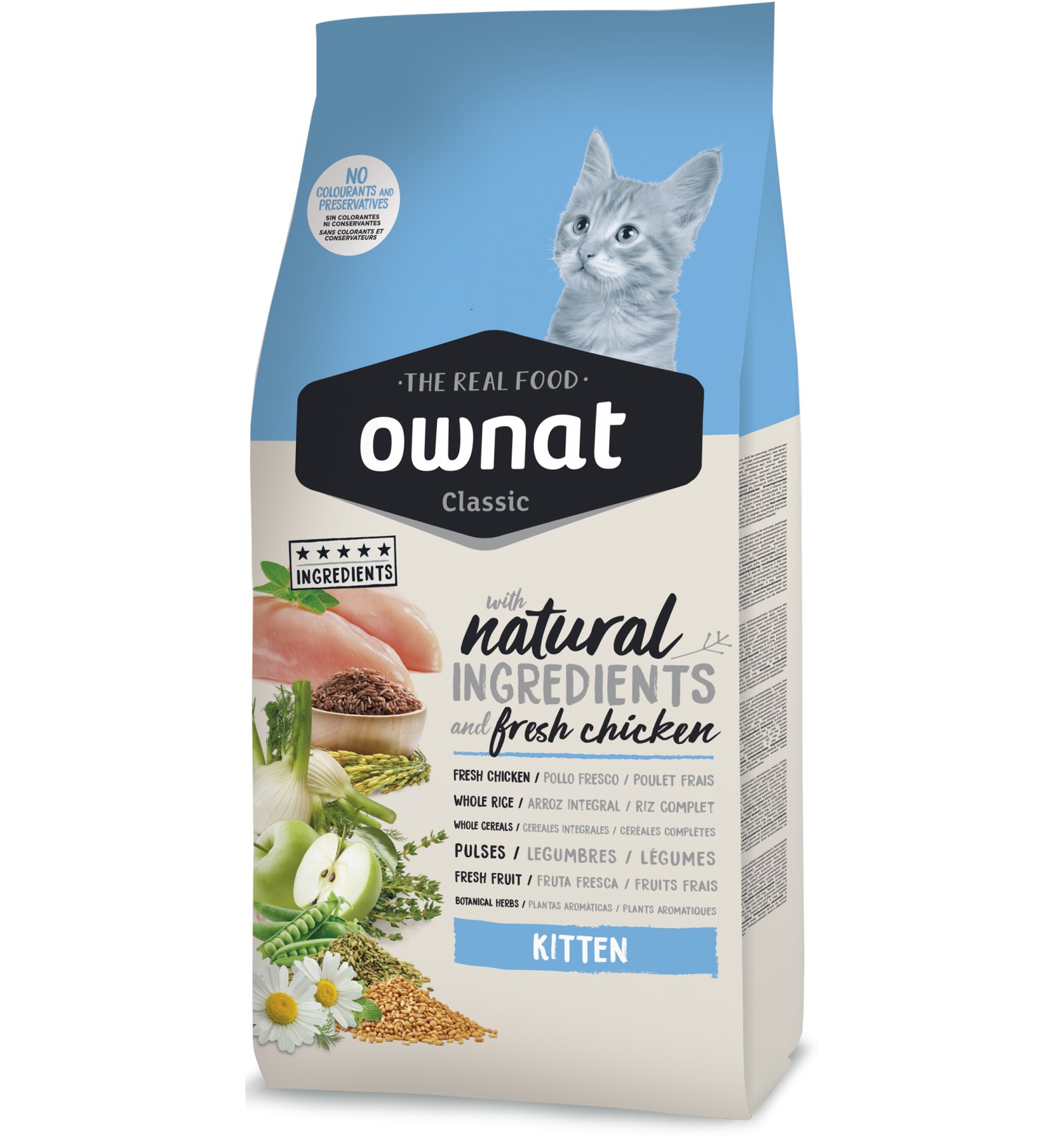Carnes 38% (carnes desidratadas 28%, frango fresco* 10% antes da extrusão), arroz integral* (15%), gordura de frango, cevada integral* (9%), milho integral* (7%), proteínas de milho, ervilhas inteiras* (4%), peixe desidratado, levedura de cerveja* (1,5%), proteína hidrolisada de frango, ovo inteiro desidratado* (1%), maçã* (1%), óleo de salmão, polpa de beterraba, fruto-oligossacarídeos e mano-oligossacarídeos, plantas aromáticas 0,02% (funcho*, flor de camomila*, anis verde*), yucca schidigera. *INGREDIENTES NATURAIS
